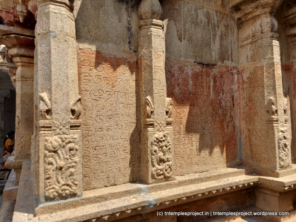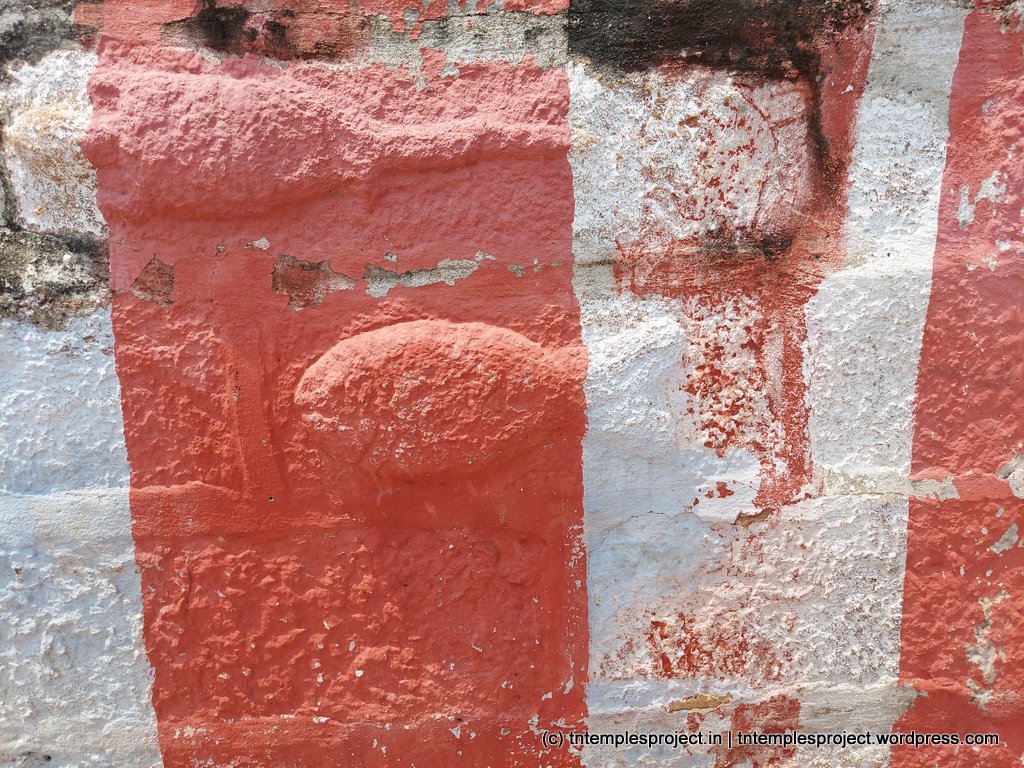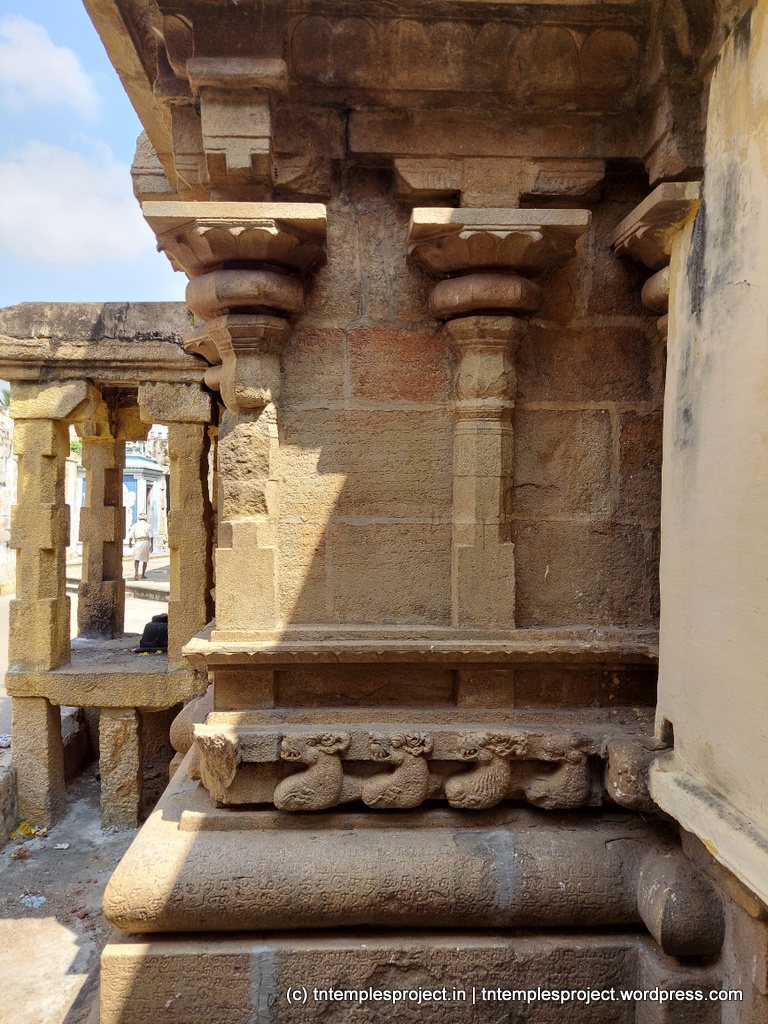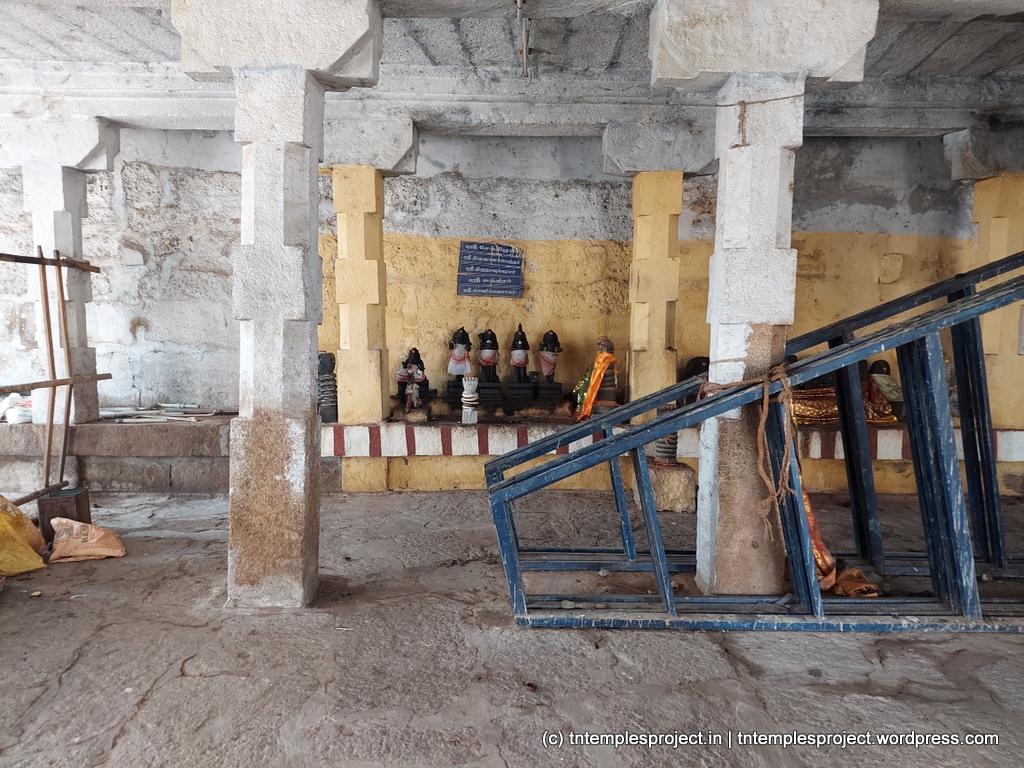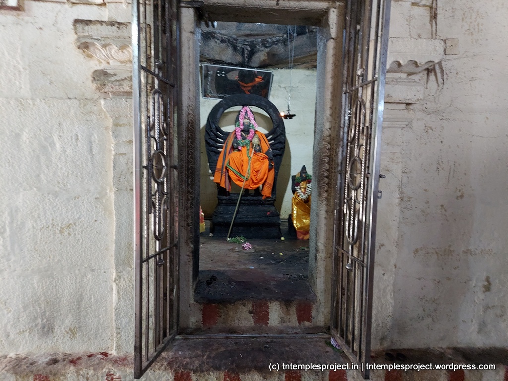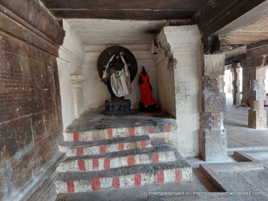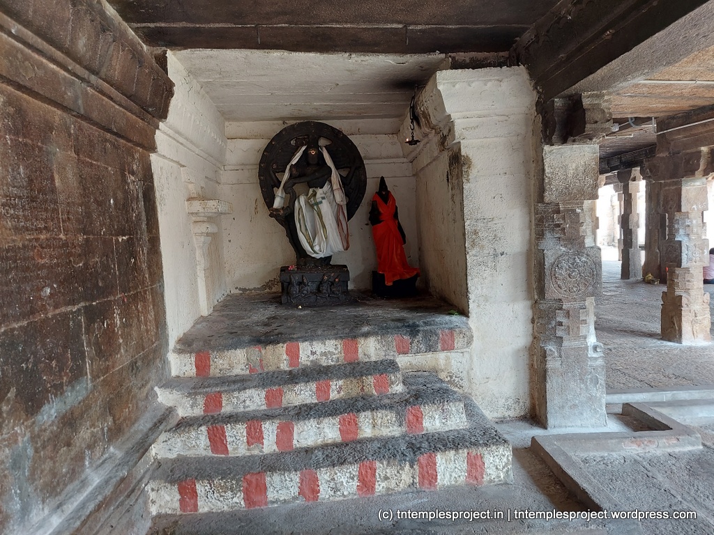 As evidence of Pandya involvement here, on the right-hand side of the front wall of the temple, is a bas relief of the Pandya motif – the fish. Inscriptions pertaining to Rajendra Chola (11th century) are found here, as are others referring to the Cholas, Pandyas, and the Vijayanagara dynasty. Earlier, the entrance to the temple used to be from the west, and therefore the gopuram on that side (which is closed), is the older gopuram of the temple. To our right, just outside the garbhagriham, is a small niche where Natarajar stands with Sivakami Amman.