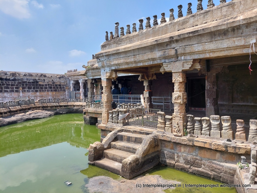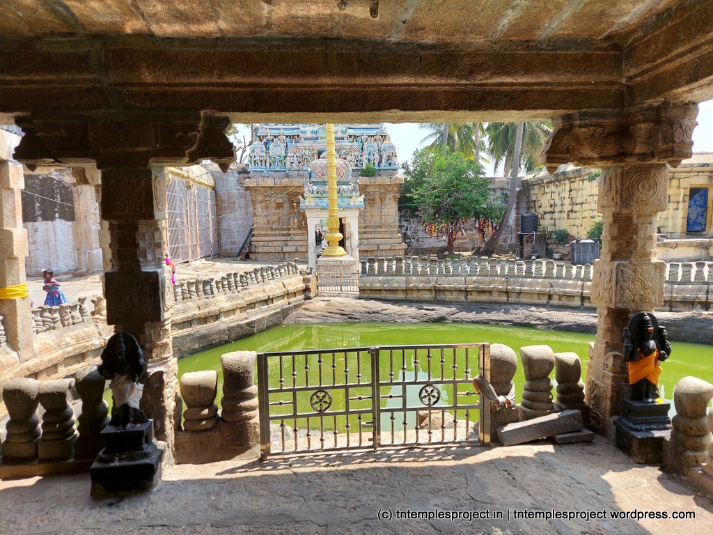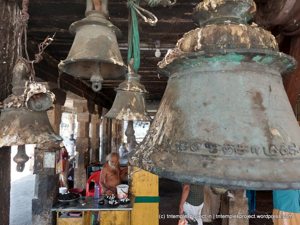 Upon entering the temple, just after the dhwajasthambam in front of Siva (there is a separate one for Amman), is the tank said to have been installed by Brahma. Of course, it is filled with rain water, these days. The unusual phenomenon here is that at the time of Meena Lagnam, towards the end of the Tamil month of Panguni (March-April) or the beginning of Chithirai (April-March), the sound of percussion and string instruments can be heard, which cannot be heard on any other days. These are believed to be the sounds of celestial instruments from Kailasam, and there is a separate puranam behind this.