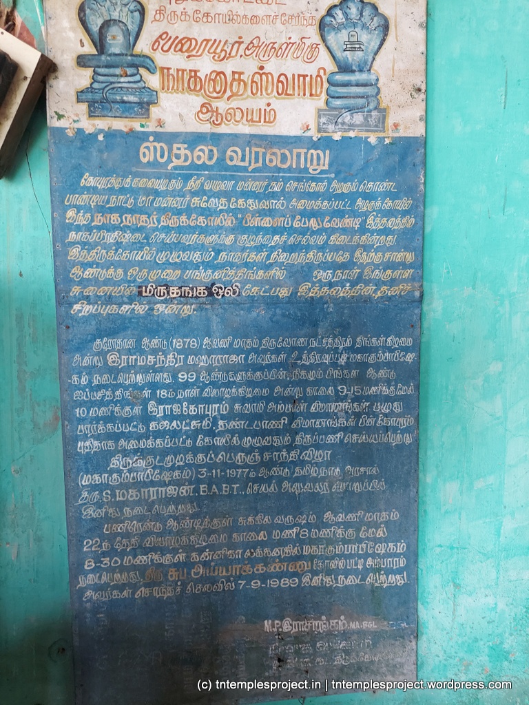 A hunter, because of a lack of prey, resorted to thieving. One day, he accosted a sage and asked him to hand over all his possessions. The sage replied that he was carrying nothing on him, as he was going to worship Naganathar at Peraiyur. As soon as he heard this, the hunter’s mind cleared, and he was immediately blessed with immense knowledge, that he stopped his wrong ways. Due to this puranam, this is regarded as a prarthana sthalam for obtaining clarity of thought, or for making the right decisions when in a quandary, or simply purging negative energies. The hunter also worshipped Siva using Sambrani (incense, or benzoin resin), and so the practice here is to offer sambrani to the Lord.