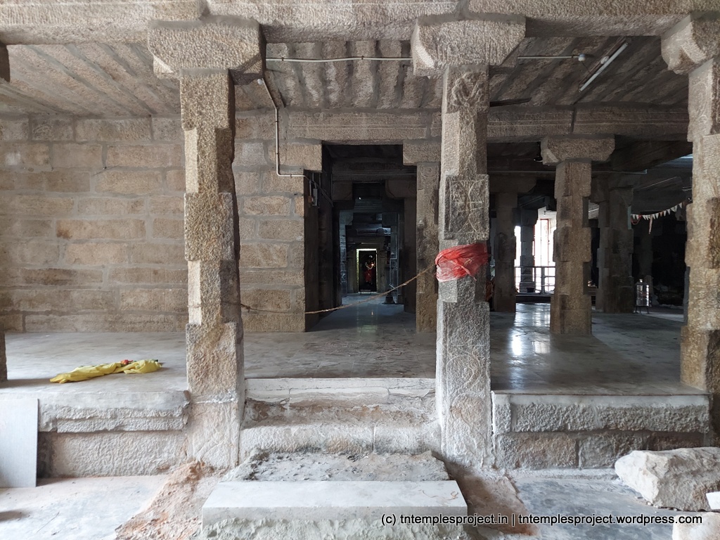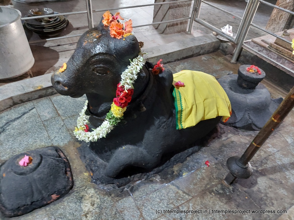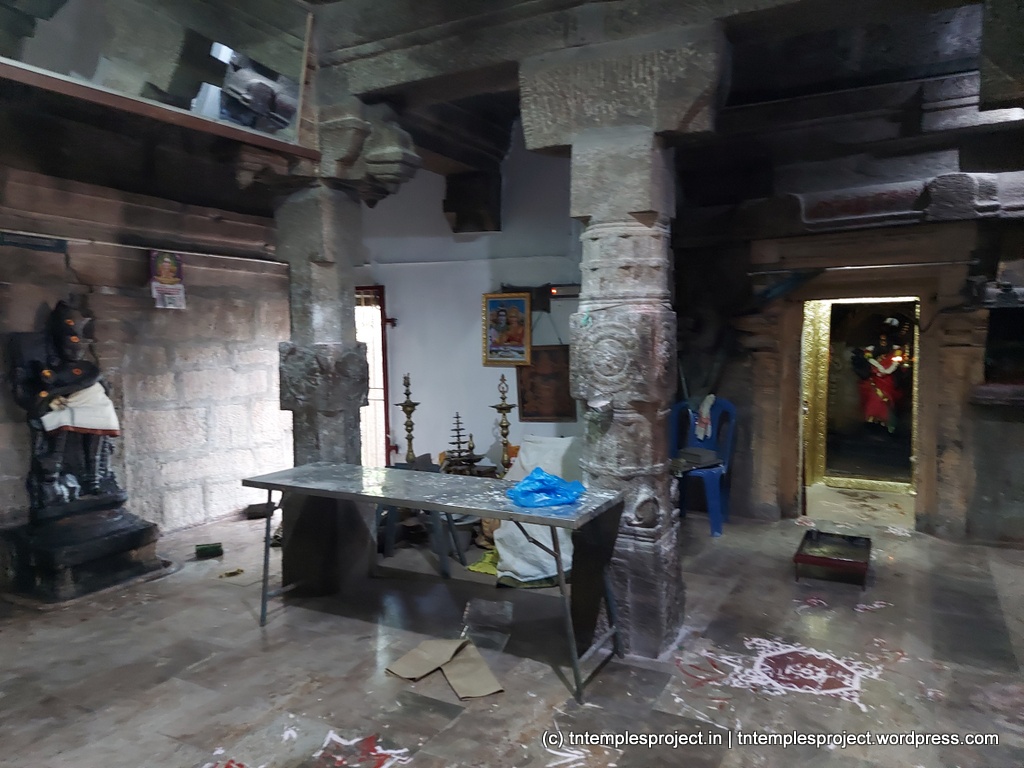 கர்ப்பகிரஹத்தில் கூட ஒரே ஒரு துவாரபாலகர்தான் இருக்கிறார். மறுபக்கம் விநாயகர். இங்குள்ள பல சிவாலயங்கள் ஒன்றையொன்று எதிர்கொள்ளும் வகையில் கட்டப்பட்டுள்ளன. இவர்களில் கர்ப்பகிரகத்தில் உள்ள சிவன், தேரடி விநாயகர்; முருகனும் கால பைரவரும்; மற்றும் விஷ்ணு, லட்சுமி.