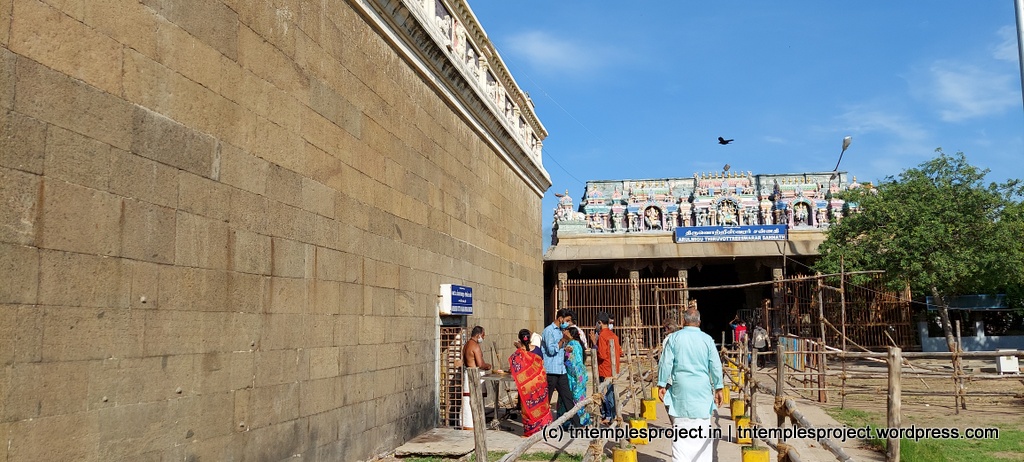 இங்குள்ள மூன்று முக்கிய சிவ வடிவங்களான ஆதி புரீஸ்வரர், தியாகராஜர் மற்றும் திருவொற்றீஸ்வரர் சந்நிதிகள் பெரியதாக இருந்தாலும், மேலே குறிப்பிட்டுள்ளபடி, மூலவர் ஆதிபுரீஸ்வரரின் உண்மையான கர்ப்பக்கிரகம் மிகவும் சிறியதாக உள்ளது. இக்கோயில் பெரிய பரப்பளவில் பரந்து விரிந்துள்ளது. பிரதான கோபுரம் ஆதி புரீஸ்வரர் சன்னதியின் அச்சுக் கோட்டில் உள்ளது, ஆனால் நந்தி மற்றும் த்வஜஸ்தம்பம் தியாகராஜர் சன்னதியை நோக்கி, இடதுபுறமாக அமைந்துள்ளது. அங்குள்ள நந்தியும் வழக்கத்திற்கு மாறாக சிவன் மற்றும் அம்மன் இருவரையும் ஒரே நேரத்தில் தரிசிக்கும் வகையில் அமைக்கப்பட்டு செதுக்கப்பட்டுள்ளது (பொதுவாக இது எல்லா சிவாலயங்களிலும் நடக்கும், ஆனால் இந்த கோவிலில் உள்ள கோணம் மற்றும் தூரம் ஆகியவை இதை இன்னும் சிறப்பாகவும் சுவாரஸ்யமாகவும் ஆக்குகின்றன. )