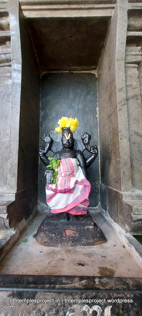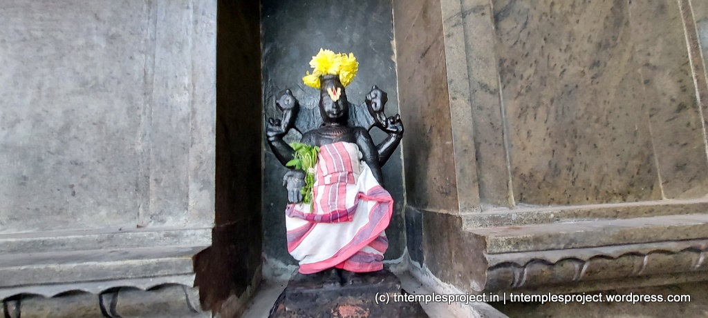 Interestingly, Vishnu is also present here along with Lakshmi. as Lakshmi Narayana Perumal, in a separate east-facing shrine to the left of the garbhagriham (as we view it). So, both Siva and Vishnu are here, with their respective consorts. However, the temple does not have a gopuram or dhwajasthambam.