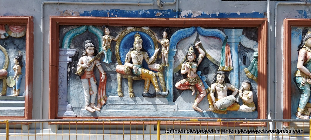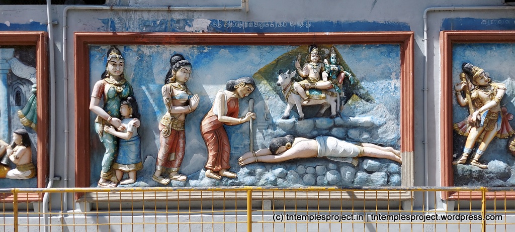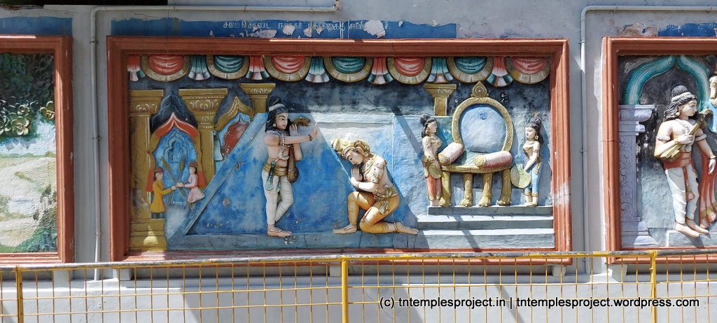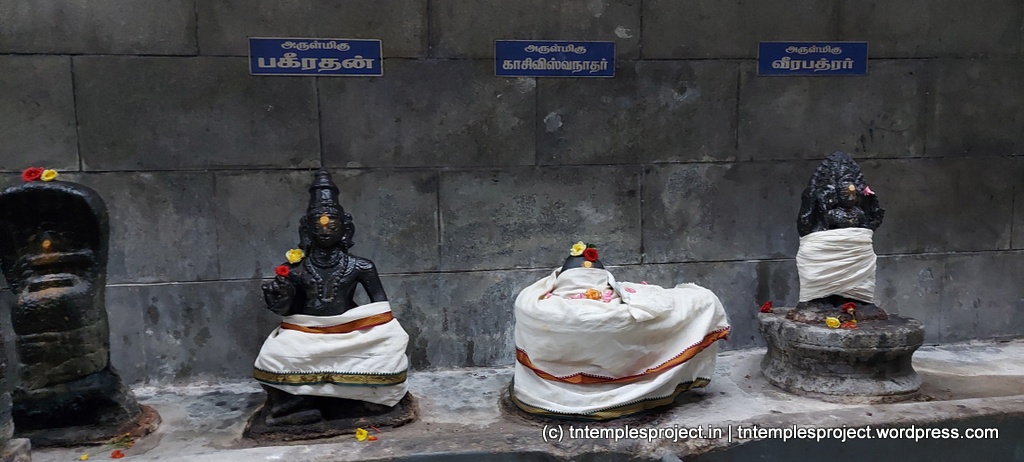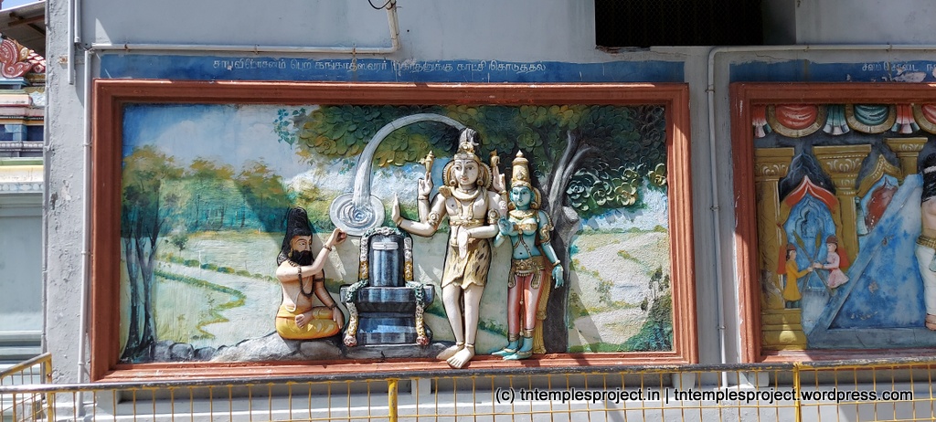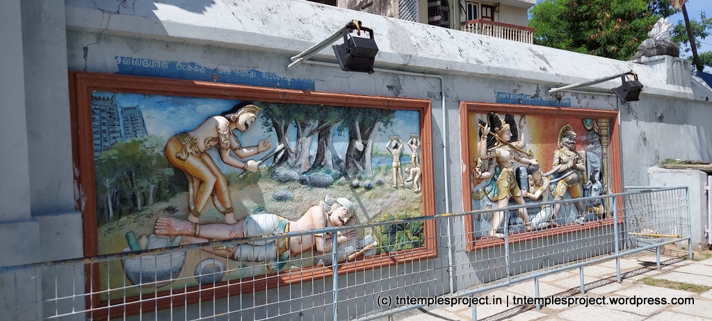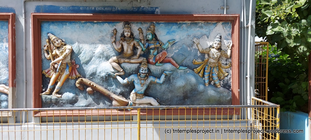 கர்ப்பக்கிரகம் மற்றும் மகா மண்டபத்தின் சுவரிலும், பிரகாரத்திலும், பகீரதன் நாரதரை அவமதித்த ஸ்தல புராணத்தின் பல்வேறு காட்சிகள் மற்றும் அதன் விளைவாக ஏற்பட்ட நிகழ்வுகளின் ஸ்டக்கோ படங்கள் உள்ளன. ஆனந்த தாண்டவம் உட்பட பிற புராணங்கள் மற்றும் திருவிளையாடலின் காட்சிகளும் உள்ளன. , மார்க்கண்டேயரைக் காக்க சிவன் யமனை உதைத்தல், மூன்று உலகங்களையும் எரித்தல் (திரிபுர-சம்ஹாரம்), ராவணன் கைலாசத்தைத் தூக்குதல் போன்றவை.
