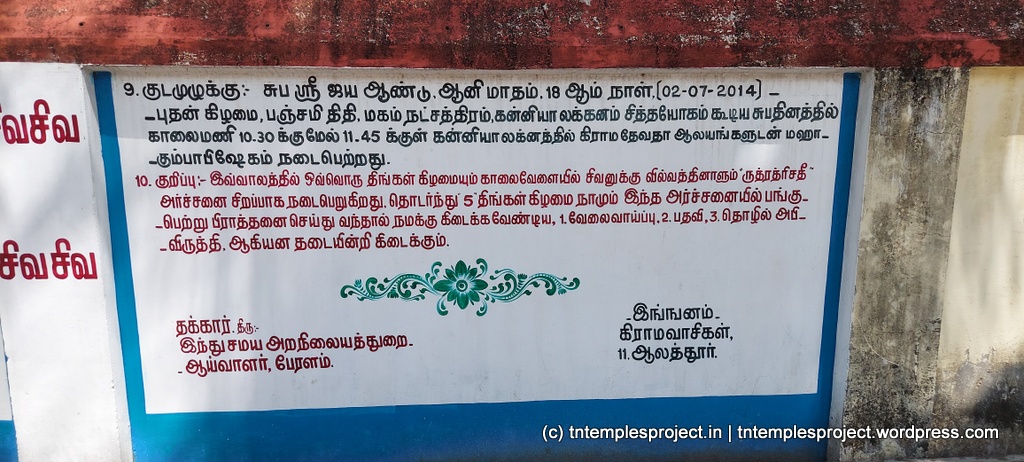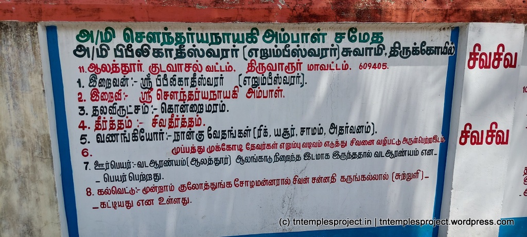 The name of the place – Alathur – is also from the sthala puranam, since aalai in Tamil refers to the banyan tree. In Sanskrit, pippilaka refers to ants. Since the Lord gave His blessing to ants, He is called Pippalapateeswarar here. The Tamil name for the deity is therefore Erumbeeswarar.