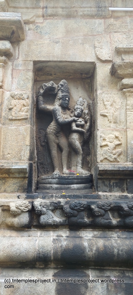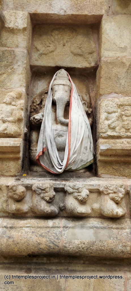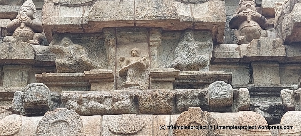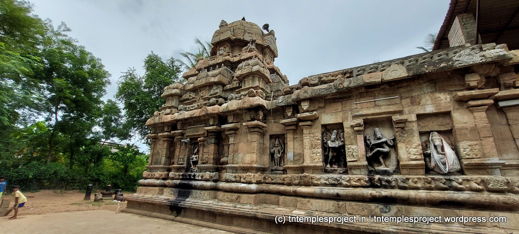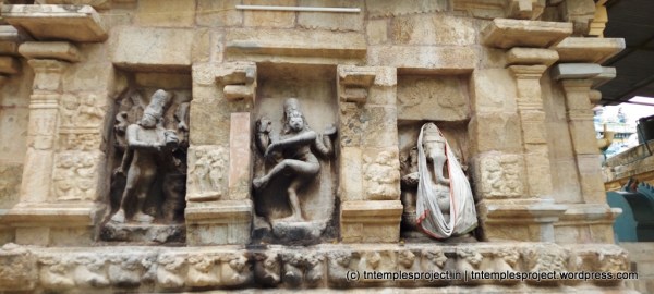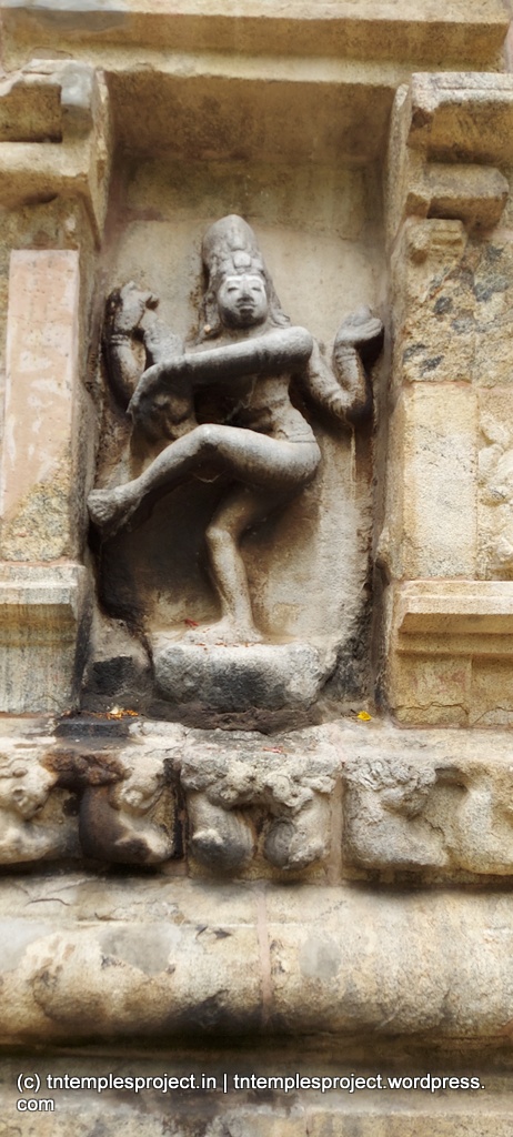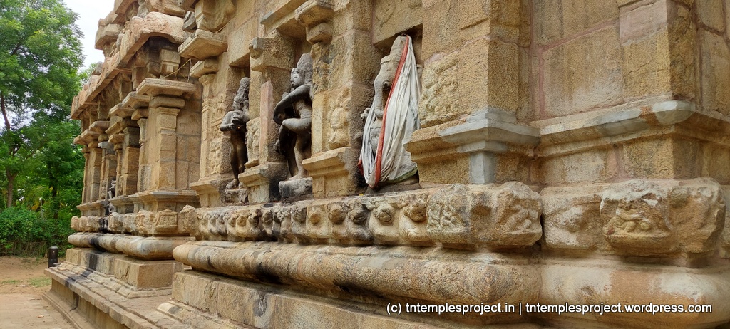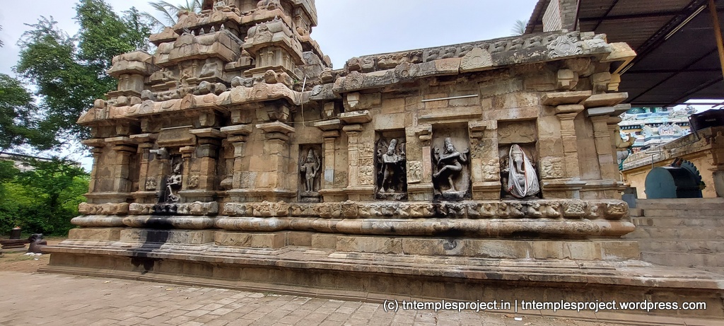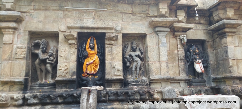 கர்ப்பகிரஹம் மற்றும் அர்த்த மண்டபத்தின் வெளிப்புறச் சுவர்களில் மொத்தம் பதினொரு கோஷ்டங்கள், ஒவ்வொன்றும் அதன் சொந்த மூர்த்திகளைக் கொண்டுள்ளன. கடிகார திசையில் சென்றால், அவை: நர்த்தன விநாயகர், தாண்டவத்தில் நடராஜர், கங்காதரேஸ்வரர், தட்சிணாமூர்த்தி, லிங்கோத்பவர், பிரம்மா, அஷ்டபுஜ பைரவர், அர்த்தநாரீஸ்வரர், அஷ்டபுஜ துர்க்கை மற்றும் கல்யாண சுந்தரர்.