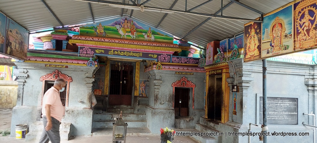 சிவனை நோக்கி நந்தி மற்றும் பலி பீடம் இருந்தாலும் த்வஜஸ்தம்பம் இல்லை. வளாகத்தின் உள்ளே, துவாரபாலகர்களின் புதைபடிவங்களுடன் கூடுதலாக, கர்ப்பக்கிரஹத்தின் பக்கவாட்டில் தனித்தனி சன்னதிகளில் விநாயகர் மற்றும் முருகன் ஆகியோரைக் காணலாம். பிரகாரத்தில், வழக்கமான தெய்வங்கள் – விநாயகர், முருகன் அவரது துணைவியார் வள்ளி மற்றும் தெய்வானை, கஜலட்சுமி, பைரவர், சண்டிகேஸ்வரர் மற்றும் நவக்கிரகம் – தனித்தனி சன்னதிகளில் உள்ளனர். கோஷ்டங்களில் நர்த்தன விநாயகர், தட்சிணாமூர்த்தி, லிங்கோத்பவர், பிரம்மா மற்றும் துர்க்கை ஆகியோரின் மூர்த்திகளும் உள்ளனர். தேவாரத் திருமேனிகளான அப்பர், சம்பந்தர், சுந்தரர், மாணிக்கவாசகர் ஆகியோருக்கும் சிறிய சன்னதி உள்ளது.
