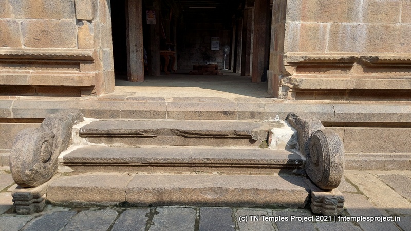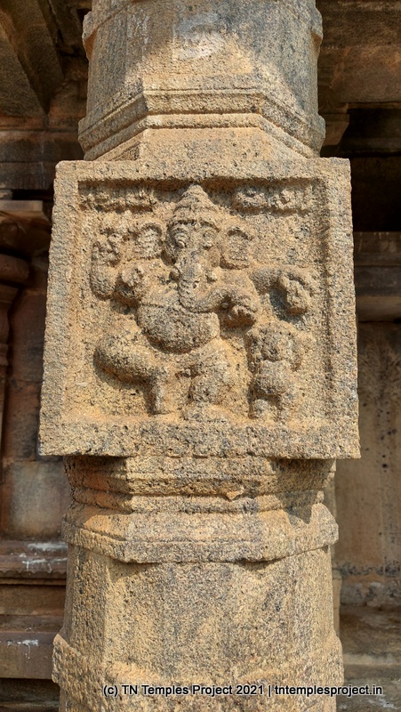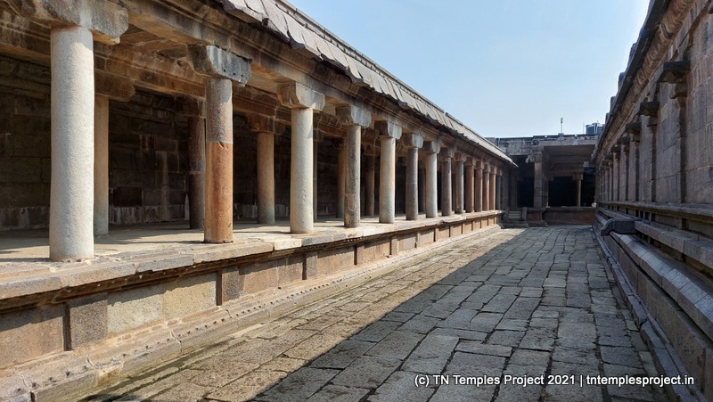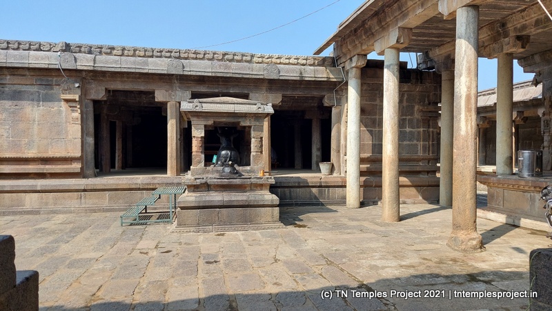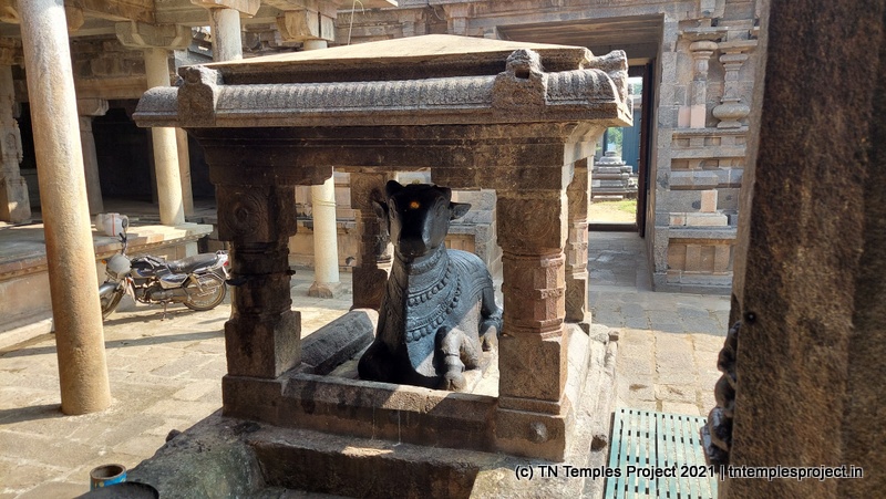 The entrance to the mukha mandapam is from the southern side, and even as one enters, one can see several beautiful bas-relief sculptures on the pillars. The late-Chola, early-Kadava (later Pallava) architecture is evident in the pillar designs. In front of the Siva Lingam is a brass Nandi, both of which were nicely lit by the sun during our visit. There is a smaller south-facing shrine for Amman in the north-east part of the corridor. In the northeast part of the main Siva temple is a 100-pillared mandapam that was traditionally used for coronations, festivals, and Veda-parayanams and upanyasams.