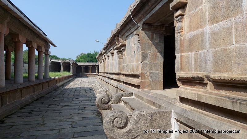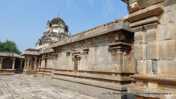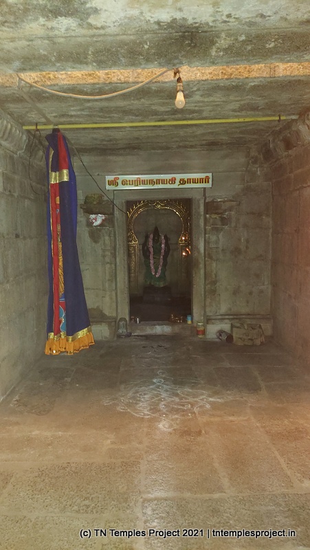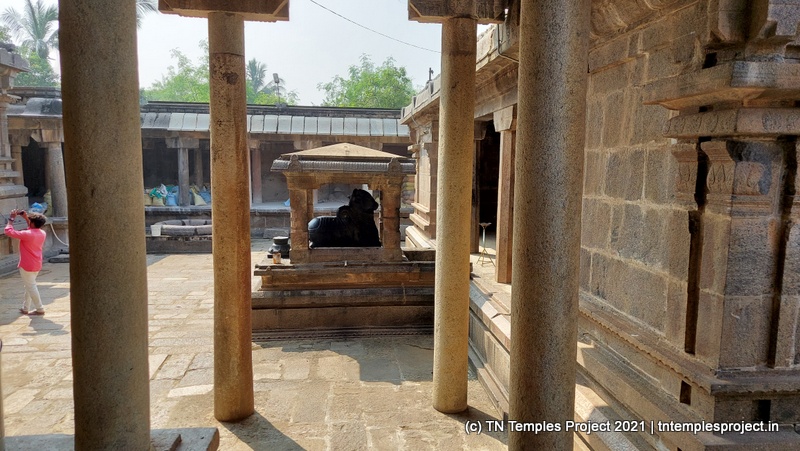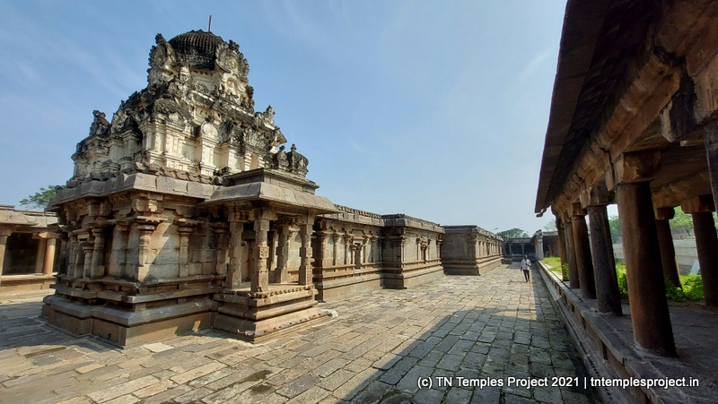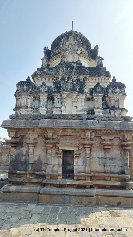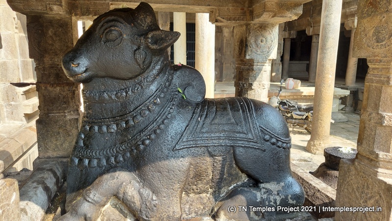 Corresponding to Kopperunjinga’s reign, this temple dates back to the 13th century. The east facing temple has a large main shrine for Siva, replete with its own prakaram, large Nandi at the entrance, and stunning architecture, particularly given its size. There is a separate east-facing shrine for Periya Nayaki Amman (whose formal name is Tiru Kamakottamudaiya Periya Nachiyar) to the north, within the temple complex.