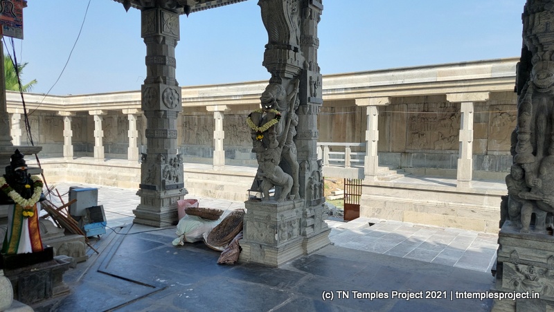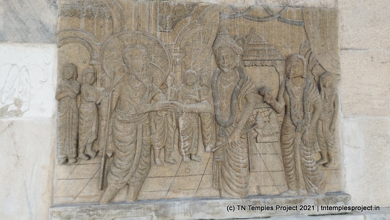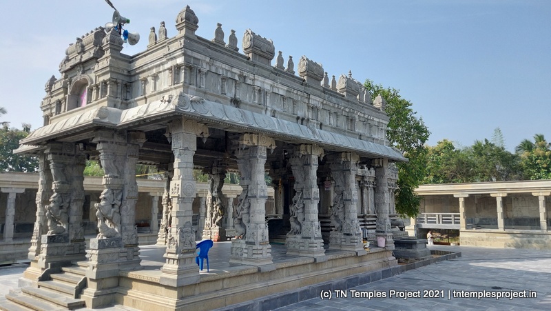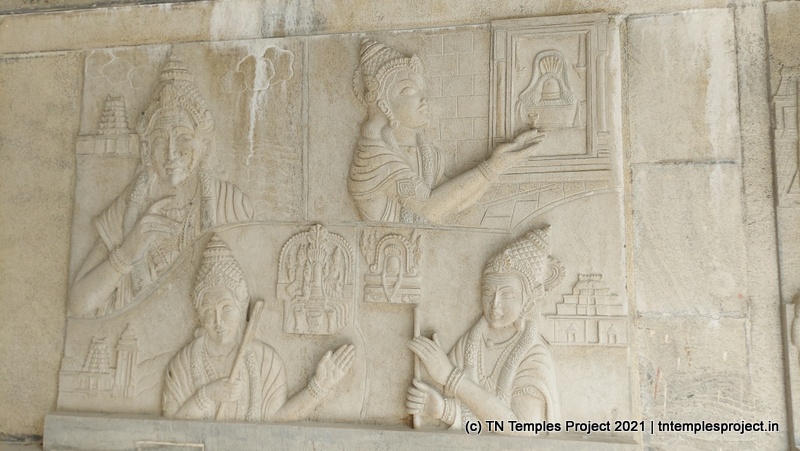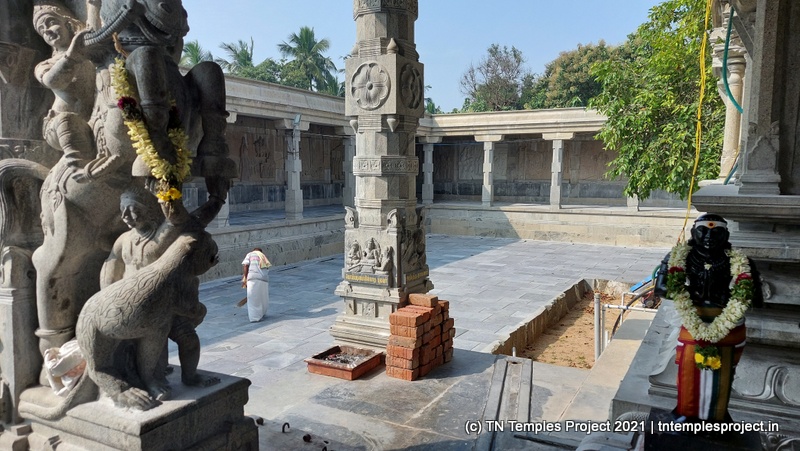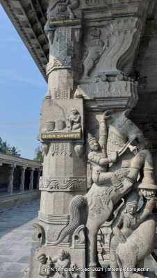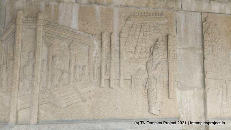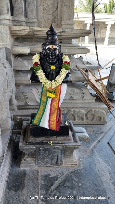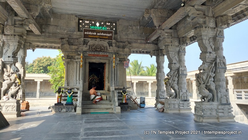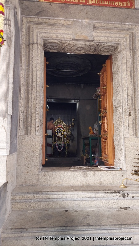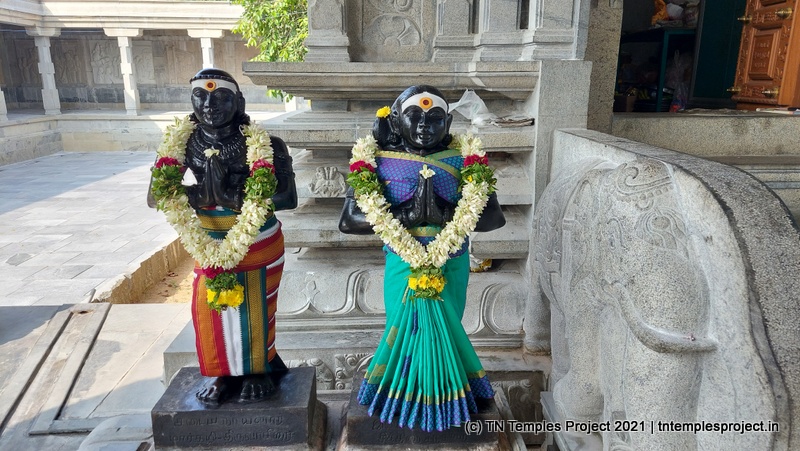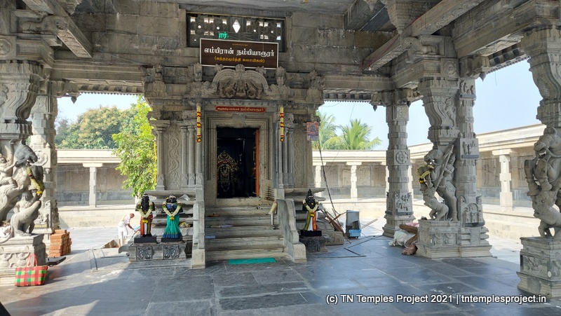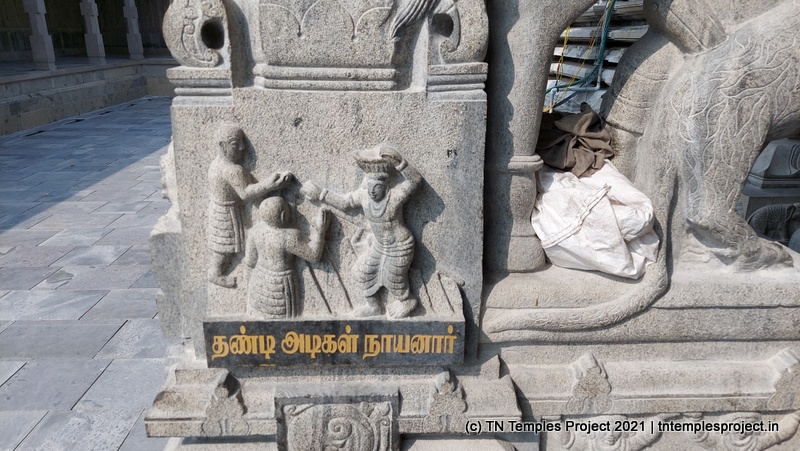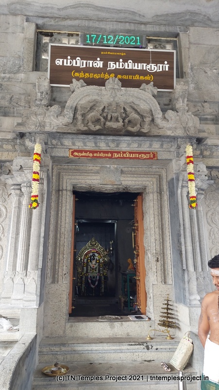 The temple houses Sundarar in the garbhagriham, and vigrahams of his parents Sadaiyanar and Isaignaniyar are just outside the garbhagriham. In the various pillars of the mandapam are bas-relief images of all the Nayanamars.