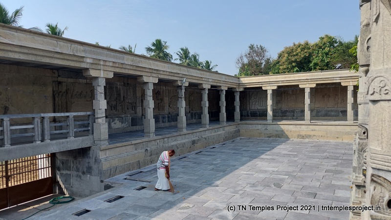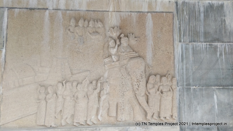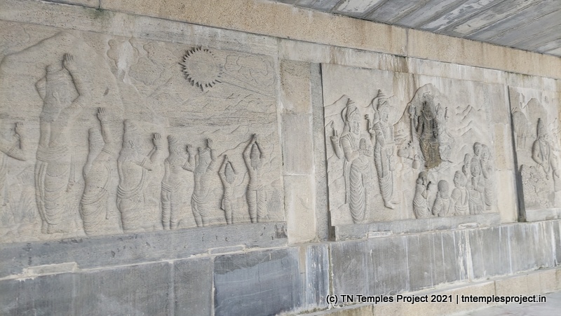 The three sides (south, west and north) of the entire inner perimeter of the prakaram, bounded by the outer wall on the other side, is filled with bas-relief sculptures of various incidents from Sundarar’s lifetime. These are in vivid detail, and anyone with even a passing knowledge of the saint’s life will be able to identify and appreciate these images, which run chronologically in clockwise direction.