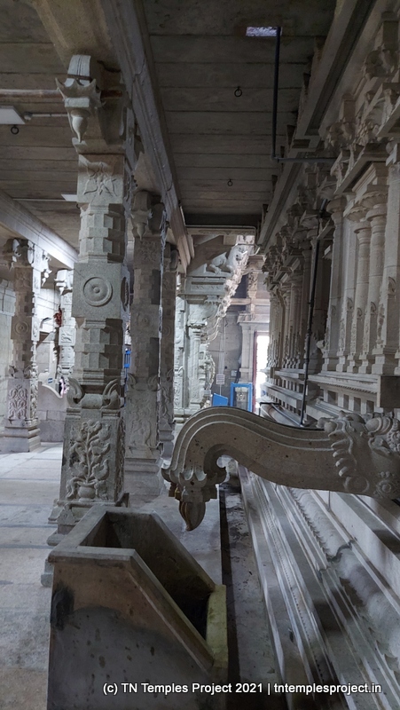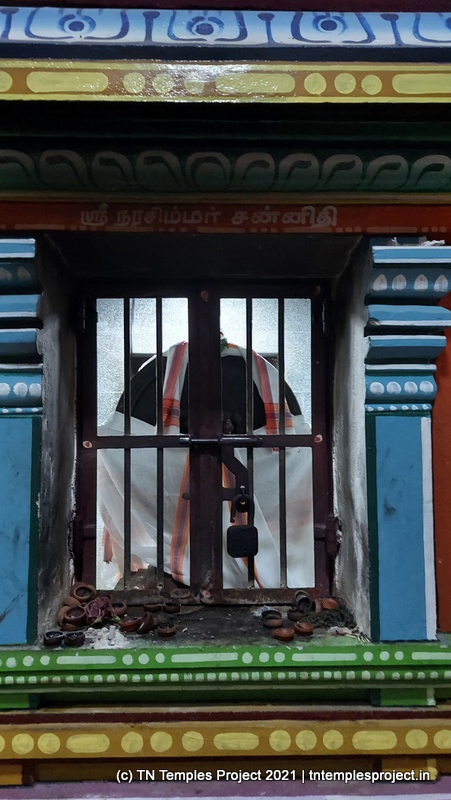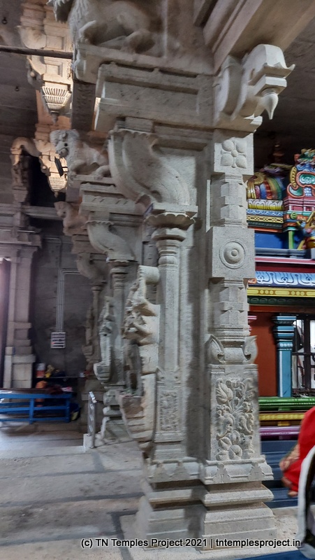 There is no raja gopuram here. The temple has a welcome arch with a stucco murti of Mahalakshmi at the entrance, and an inner three-tiered gopuram. Inside the maha mandapam is a rather tall Garudasthambam / dhwajasthambam, with Garudar at the base. There is a beautiful rasi mandalam carved on the ceiling here. The architecture here covers a range of sizes – from the very large to the minute – but with the same level of nuance and finesse.