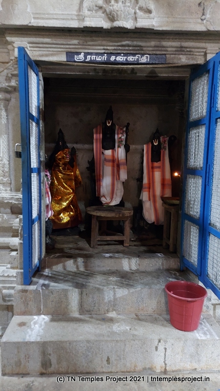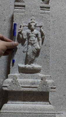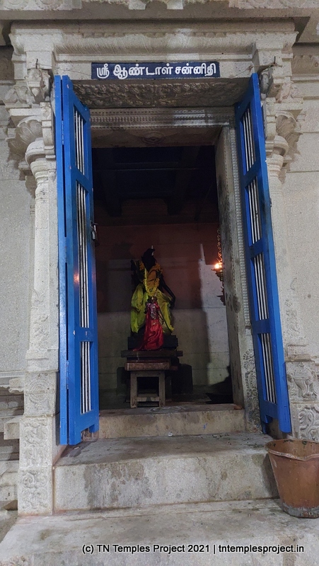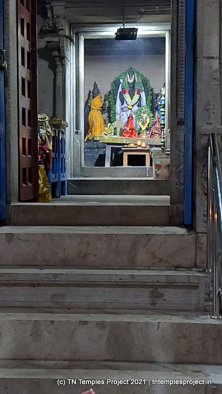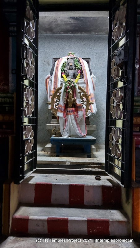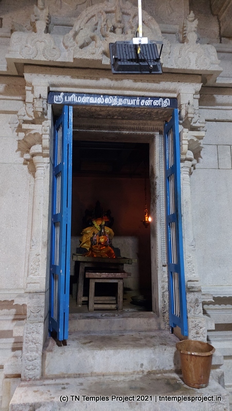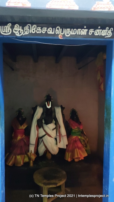 The moolavar – Adi Kesava Perumal – is depicted in nindra kolam and displaying the abhaya mudra, flanked by Sridevi and Bhudevi on either side. There is a separate sannidhi for Parimalavalli Thayar, and for Andal. There are also separate shrines for Vishnu as Varadaraja Perumal, Chakrathazhwar and also Peiazhvar, Nammazhvar, Tirumangaiazhvar and Ramanujar.