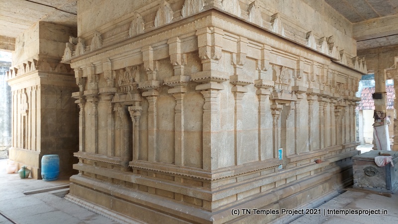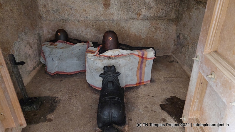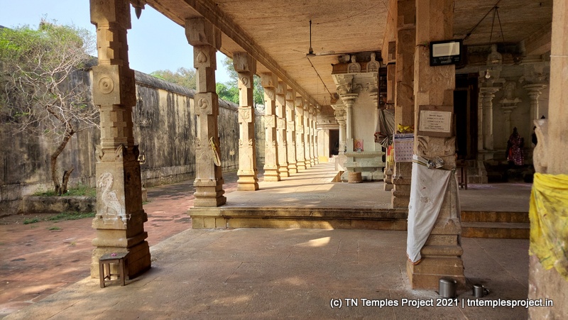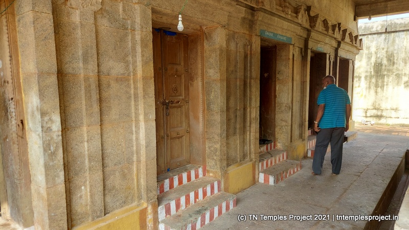 Unfortunately, there was nobody at the temple when we visited. In fact, the temple’s doors were closed, though we took a chance and pushed the gates open, and were inside the premises. Throughout our visit, there was nobody who came – not even a local – to check what was happening. The good part of this was we had an undisturbed visit. The lamentable part was that the garbhagriham and Amman sannidhi were closed.