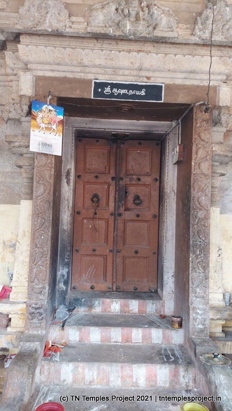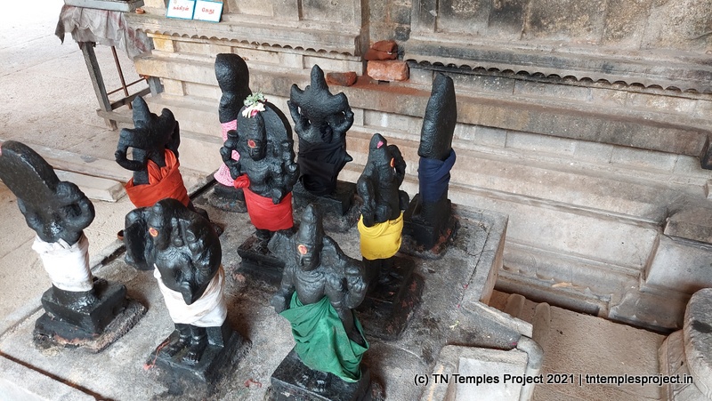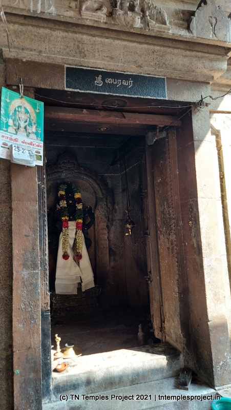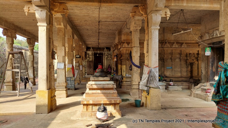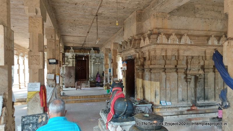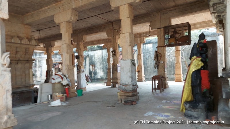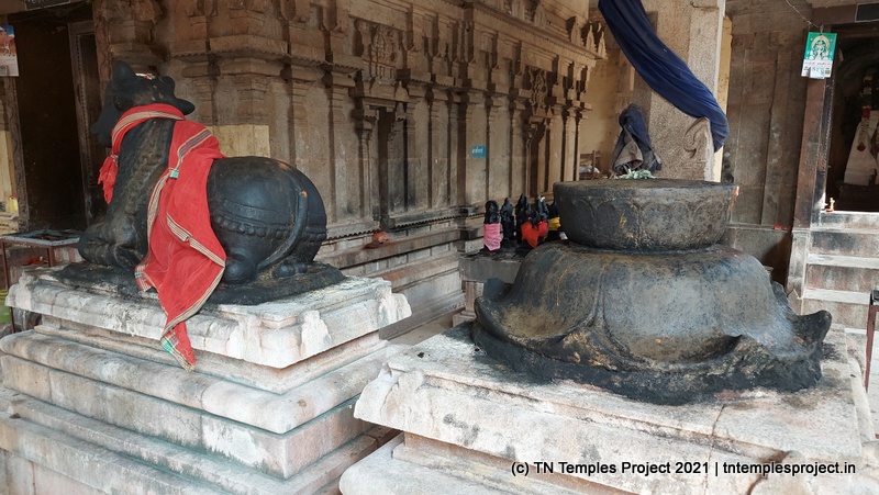 There is no dhwajasthambam here, however, there is a small Vinayakar vigraham on the ground just before the bali peetham and Nandi mandapam. The maha mandapam itself is fairly spacious, with several uniform pillars. On the right are shrines for Bhairavar and Avudainayaki Amman.