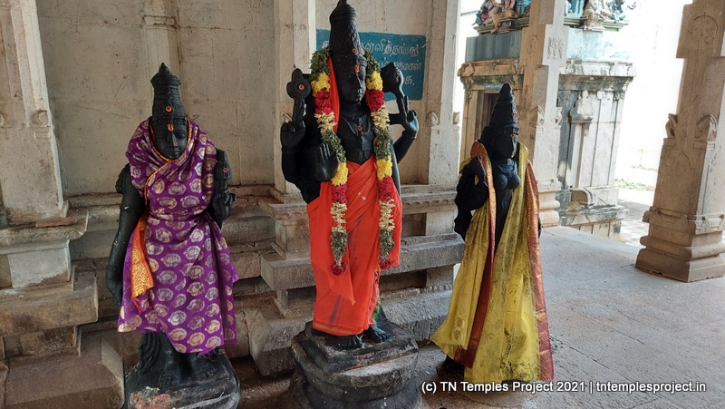 Outside the garbhagriham, to the right, are Sundararaja Perumal along with Sundaravalli Thayar and Alarmel Mangai Thayar, in the open. The three murtis are very well crafted, despite being contemporary.