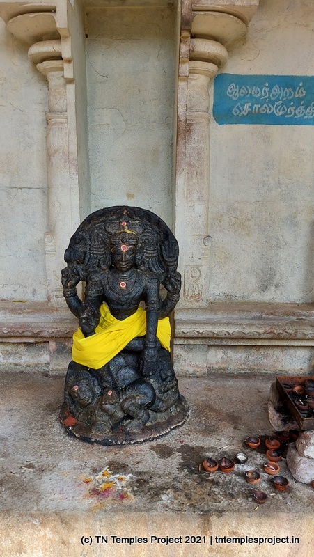 The koshtams have Dakshinamurti, Brahma and Durga. Interestingly, the koshtam deities are not inside the niches as such, but on a pedestal that juts out from the outer wall of the garbhagriham.