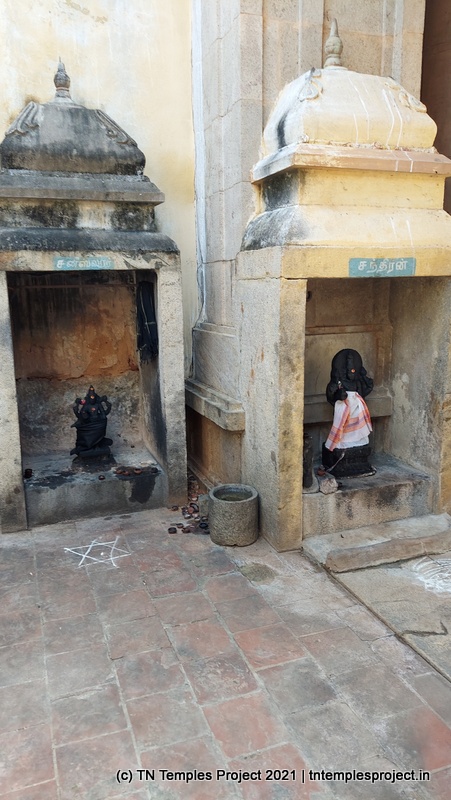 The maha mandapam itself encloses a set of shrines at the rear (sort of like an inner prakaram), which houses shrines for the sthala Vinayakar, Viswanathar and Visveswarar with Visalakshi Amman, Murugan and his consorts, Tirumagal (Mahalakshmi), and Chandikeswarar. In the outer prakaram are shrines for Sani, Bhairavar, Chandran, Suryan, and Navagraham.