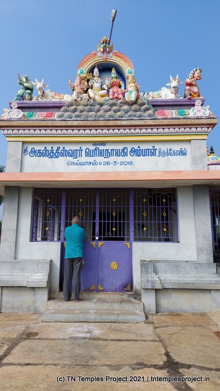 அகஸ்தீஸ்வரர் மற்றும் பெரியநாயகிக்கான அசல் கோயில் முற்றிலும் இடிந்து கிடக்கிறது, ஏறக்குறைய முழுவதுமாக புல்லுருவிகள் மற்றும் தாவரங்களால் மூடப்பட்டிருக்கும், கோயிலே கிழக்குப் பகுதியைத் தவிர வெளியில் இருந்து பார்க்க முடியாது. சில மீட்டர் தொலைவில் பழைய மூர்த்திகள் போல் தோன்றும் புதிய செங்கல் கோயில் உள்ளூர் மக்களால் கட்டப்பட்டது.