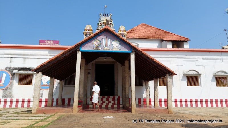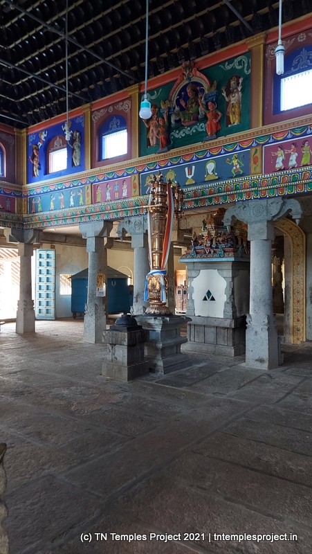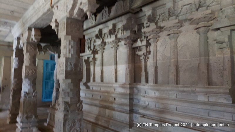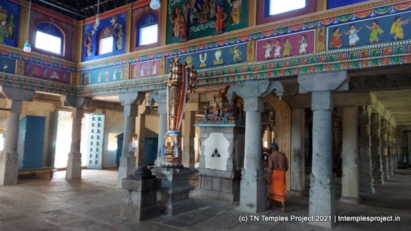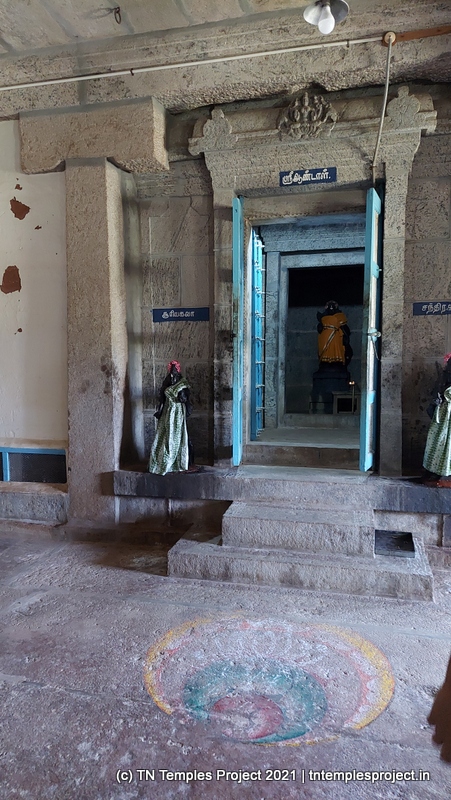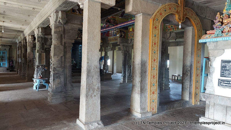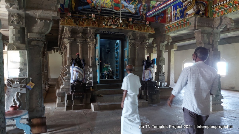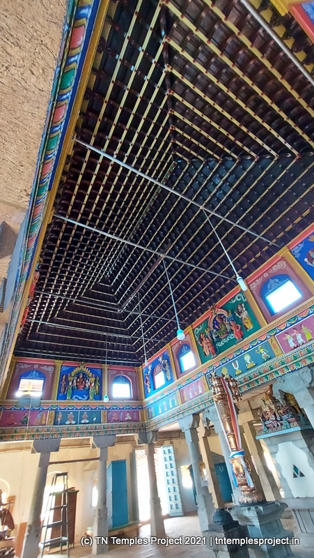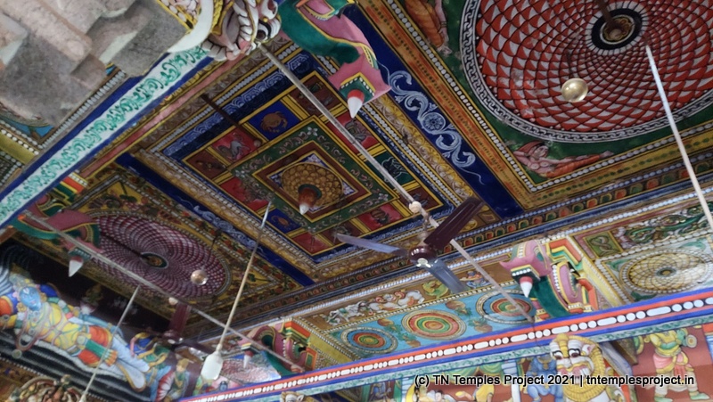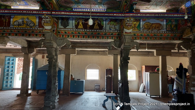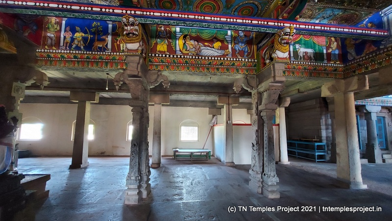 While the temple faces east, the entrance is from the south, where one is first met by Vinayakar (who is noted as such, and not as Thundikkai Azhvar). The ardha mandapam leads to the elevated garbhagriham, both of which are ornately carved from granite and feature pillars with various sculptures, including from Vishnu’s Dasavataram. The roof and upper part of the pillars are also painted with bright vegetable dye, again portraying scenes from the Dasavataram and the puranams.