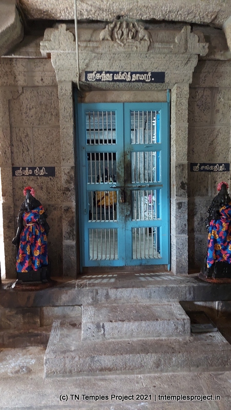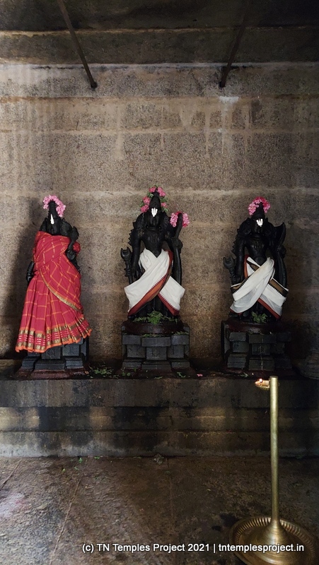 The moolavar – Sundararaja Perumal – is in the garbhagriham in amarndha kolam, while the utsavar is in nindra kolam. There are separate shrines for Sundaravalli Thayar and Andal. There is a separate south-facing shrine for Rama and Sita with Lakshmana, as well as others for Vishwaksena and azhvars.