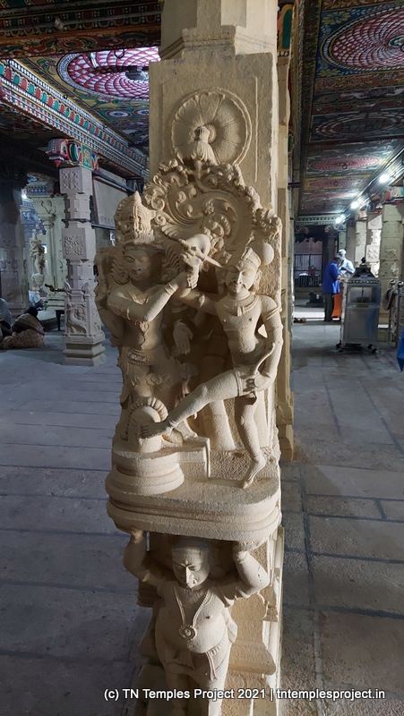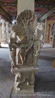 - Depiction of the Meenakshi-Sundareswarar wedding, with Vishnu giving away His sister’s hand in marriage, carved from a single stone