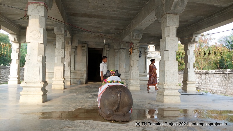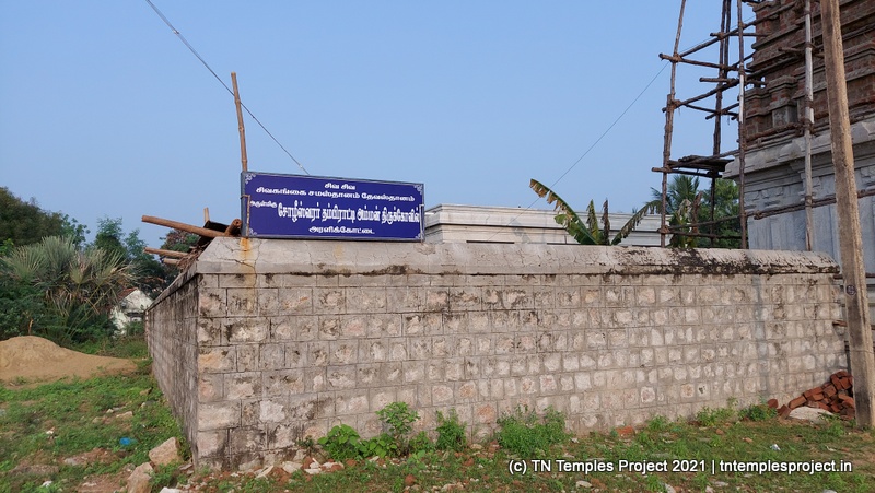 புதிய ராஜகோபுரம் கட்டப்பட்டு வருகிறது. இங்கு துவஜஸ்தம்பமோ, பலி பீடமோ இல்லை. மண்டபம் இல்லாத தனியொரு நந்தி மகா மண்டபத்திற்கு வெளியே சோளீஸ்வரரை நோக்கி நிற்கிறது. மகா மண்டபத்திற்கு அப்பால் அர்த்த மடம் உள்ளது, வலதுபுறம் தம்பிராட்டி அம்மனின் தெற்கு நோக்கிய சன்னதி உள்ளது –