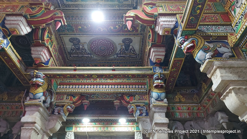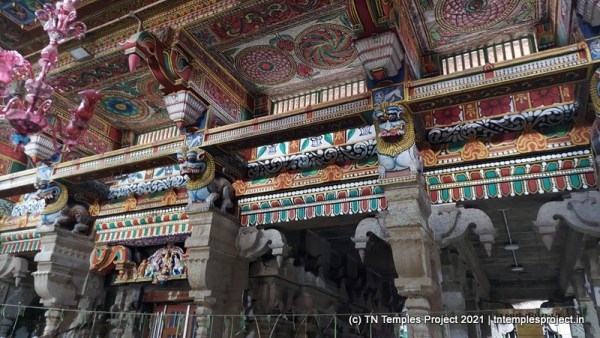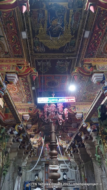 The upper part of the structure, as well as the ceiling, is painted with vibrant vegetable dye paints, and presents a pleasing sight. In the middle of the maha mandapam are old-time chandeliers that have come to typify most Nagarathar temples.