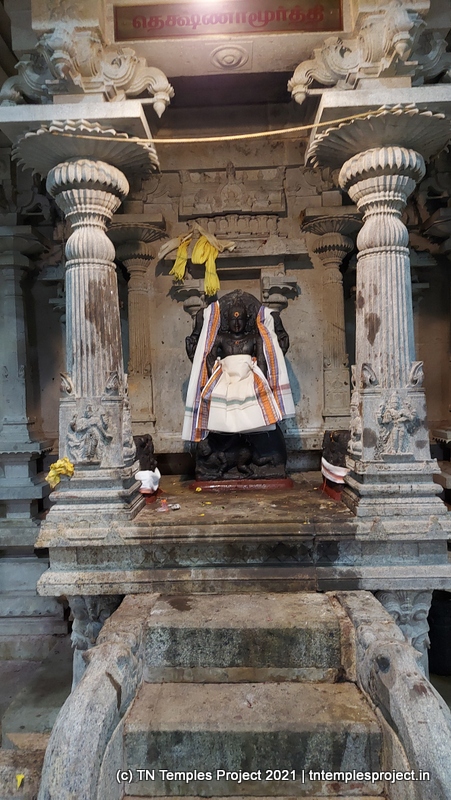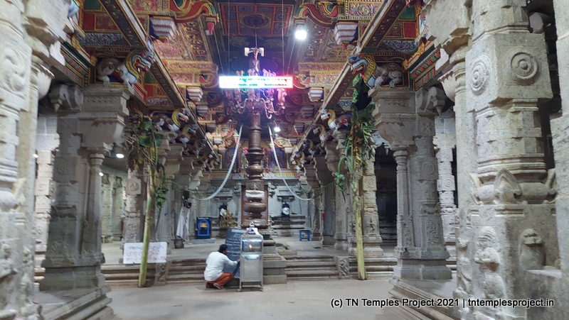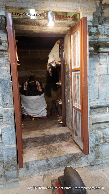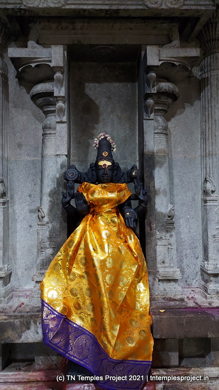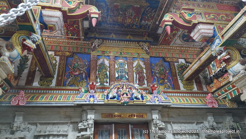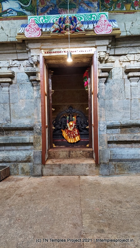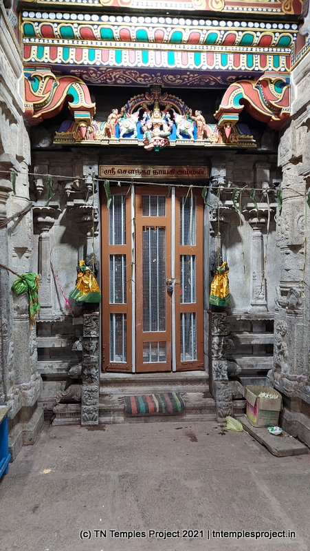 Straight ahead is the garbhagriham housing the moolavar, whose entrance is guarded by Vinayakar and Murugan. To the right is the south-facing shrine for Soundara Nayaki Amman. In the koshtams, one can find the usual Nardhana Vinayakar, Dakshinamurti (in a separate shrine, which is a common feature of temples in this region), Lingodhbhavar, Brahma and Durga.
