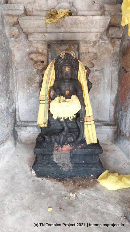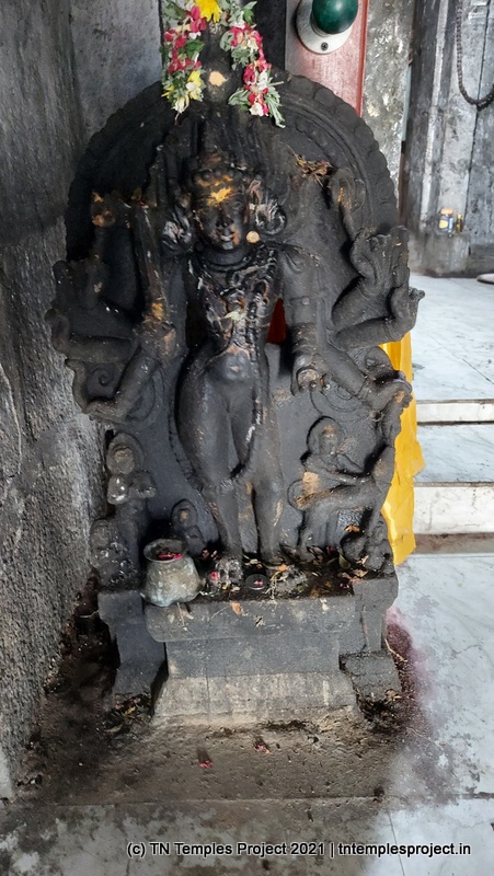 The general form of Bhairavar here is very similar to Murugan as Baladandayudhapani at Palani, depicted holding a spear. This shrine for Bhairavar is separate, with its own vimanam, which is unusual, but also implies the prominence of Bhairavar at this temple.