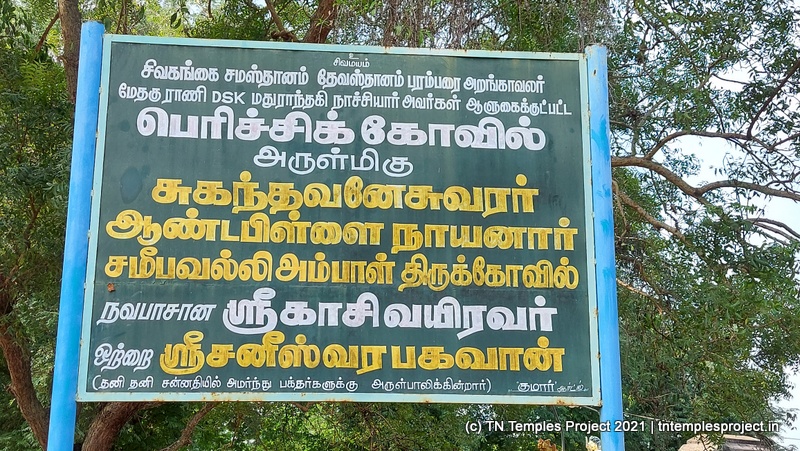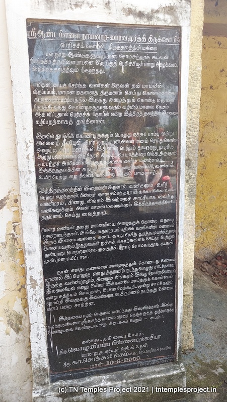 There are two stories on why this place is called Perichiyur. According to one version, in ancient times, this place was called Perichiyur. Going by the other version, the name of this place was originally Periya Nachiyar Koil (possibly named for Velu Nachiyar, the queen of Sivaganga who fought the British) – this named evolved into Periya Nachi Koil, and then into Perichi Koil.