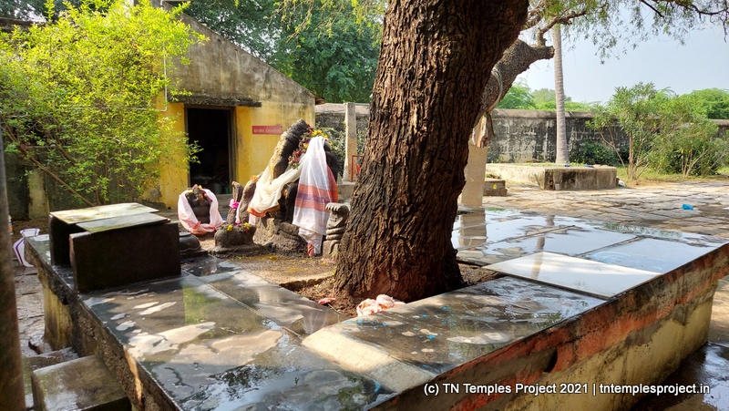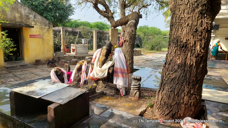 Once there was a merchant of Madurai, who was already married. But the prevalent custom at the time meant he could also take another wife. His uncle, who lived in this region, had therefore asked the merchant to marry his (the uncle’s) daughter. The couple were to get married at this place, but the night before the wedding, the merchant died of a snakebite. At the time, Sambandar was visiting this temple, and hearing the woeful cries of the bride, made inquiries. Upon learning what had transpired, he sang a pathigam imploring Siva here to bring the groom back to life, which the Lord did. Immediately, Sambandar presided over a wedding where the merchant and his bride were married off, with the vanni tree, temple well and the Siva Lingam as witness. Afterwards, the merchant and his new bride returned to Madurai, where the merchant’s first wife spewed hatred at the new girl, going so far as to suggest that no marriage had taken place at all. The bride fervently prayed to Siva, who made the three witnesses (the vanni tree, temple well, and Siva Lingam) appear in Madurai, and so demonstrating the truth. (This story, which is regarded as one of the 64 Tiruvilaiyadals of Siva, is quite similar to the sthala puranam of the Satchinathar temple at Tiruppurambiyam near Kumbakonam.)