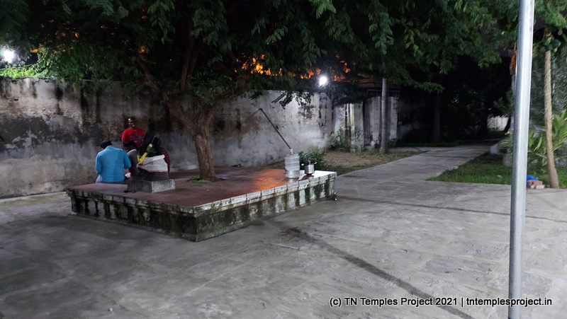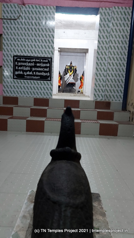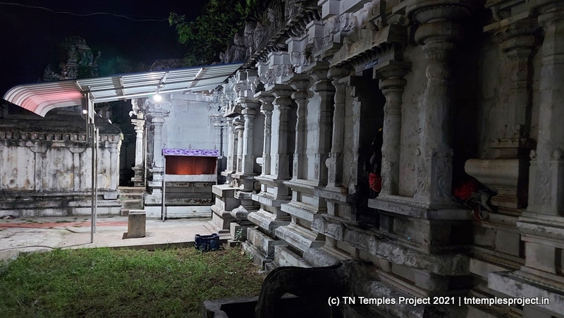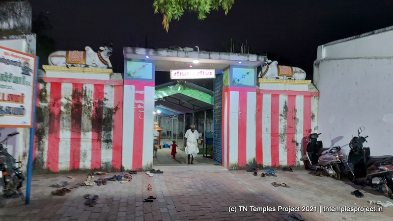 The temple does not have a gopuram, but only a high gate, flanked by Nandis on the top of the adjoining walls. A long passageway flanked by nandavanams (gardens) on either side, and in which the sthala vriksham is also present on a platform, brings us to a small tin-roof covered portion housing the dhwajasthambam, bali peetham and Nandi mandapam.