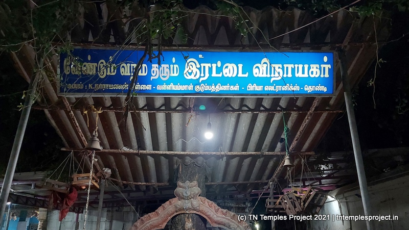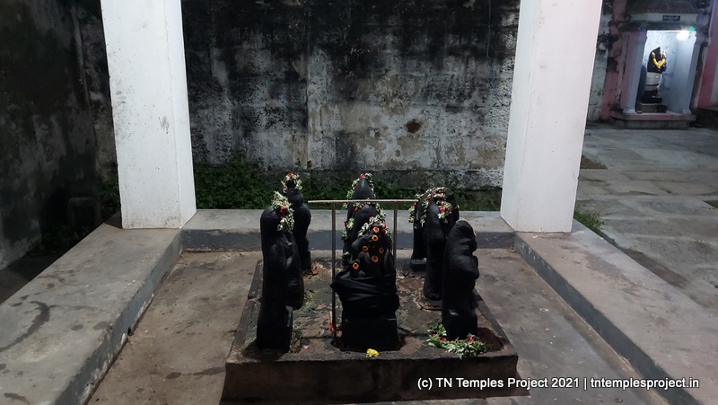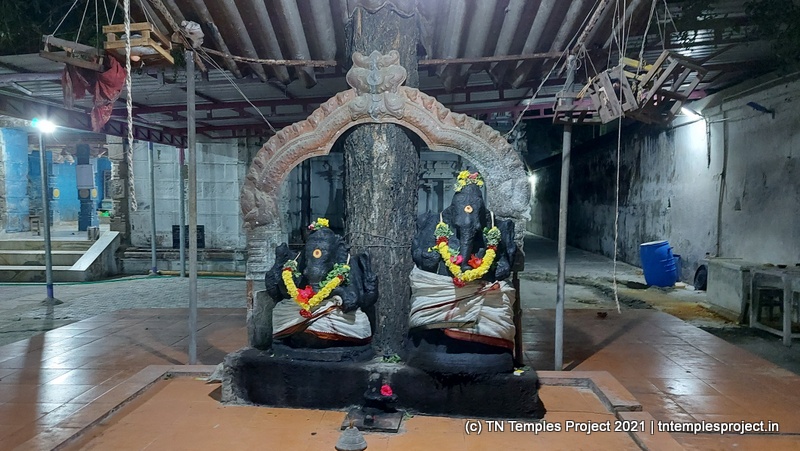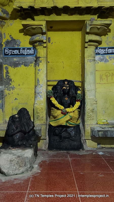 In the koshtams are Vinayakar, Dakshinamurti, Lingodhbhavar, Brahma and Durga. Interestingly, Dakshinamurti is depicted with only two sages beside Him. In the prakaram are shrines for Vinayakar, Murugan with his consorts Valli and Deivanai, Chandikeswarar, Bhairavar, Suryan, Chandran, and two Vinayakars under a tree, who are called the Vendun Varam Tharum Rettai Vinayakar (the twin Vinayakars who give whatever is asked for). There is also a separate Navagraham shrine.