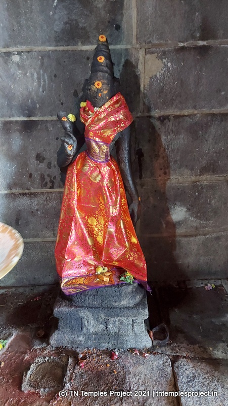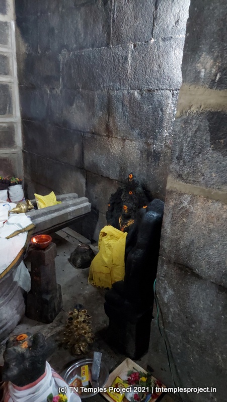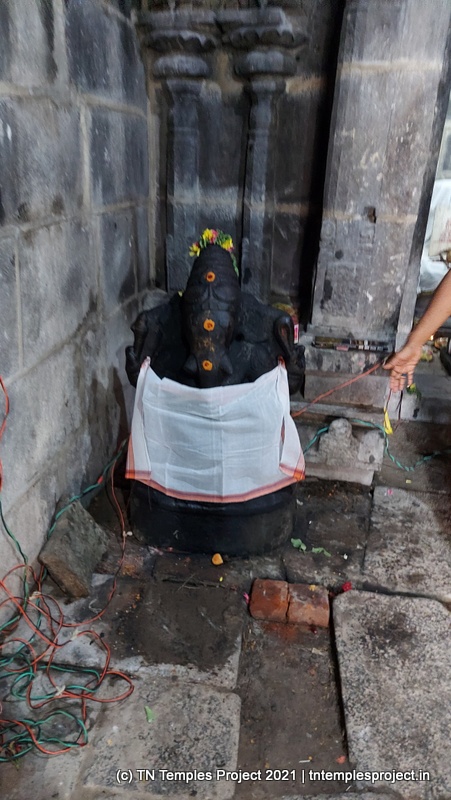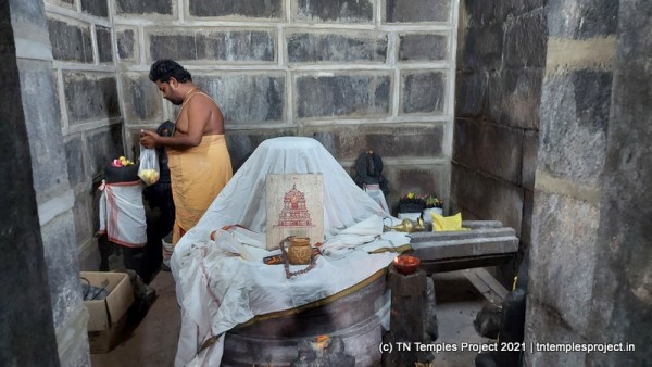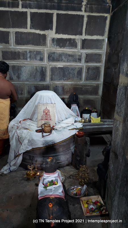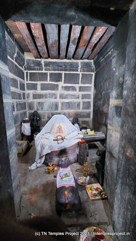 கர்ப்பகிரஹத்திற்கு சற்று வெளியே, இடதுபுறம் விநாயகர் மூர்த்தி கர்ப்பகிரஹத்திற்கு காவலாக இருக்கிறார். கட்டுமானப் பணிகள் நடைபெற்று வருவதால், கோயிலின் அனைத்து விக்ரஹங்களும் கர்ப்பகிரகத்தில் வைக்கப்பட்டன. பிரமாண்டமான சிவலிங்கத்தை அசைக்க முடியாமல், துணியால் மூடி வைக்கப்பட்டிருந்தது. உள்ளே இருந்த மற்ற தெய்வங்களில் திருக்கார்ணவல்லி அம்மன், தட்சிணாமூர்த்தி, சண்டிகேஸ்வரர், நந்தி, சூரியன், சந்திரன் ஆகியோர் அடங்குவர். தனி நவகிரஹம் சன்னதியோ, விக்ரஹங்களோ இருப்பதாகத் தெரியவில்லை.
