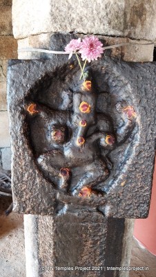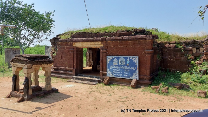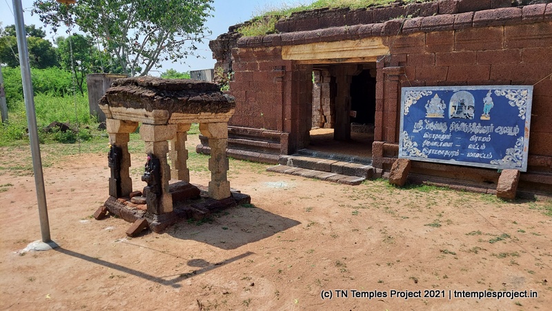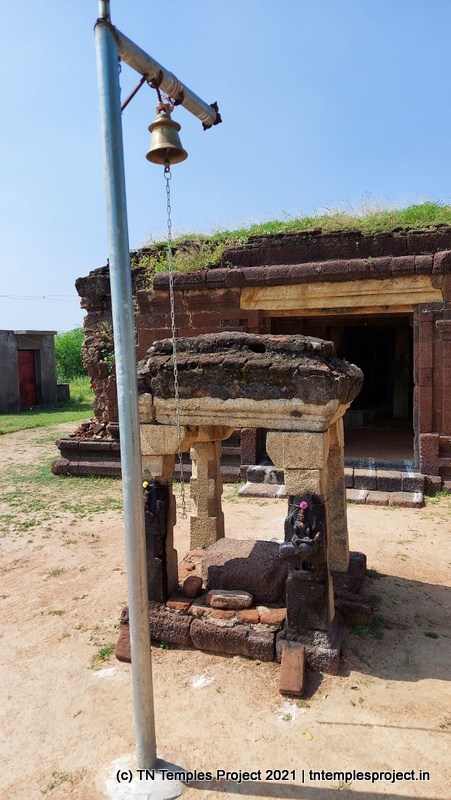 துவஜஸ்தம்பம் இல்லாத நிலையில், கோவிலின் நுழைவாயிலில் மணியுடன் கூடிய கம்பம் உள்ளது, அதைத் தொடர்ந்து நந்தியைக் காணாத நந்தி மண்டபம் உள்ளது. இருப்பினும், முன்பக்க இரண்டு தூண்களின் கிழக்குப் பக்கத்தில் விநாயகர் மற்றும் முருகன் ஆகியோரின் புடைப்புச் சித்திரங்கள் உள்ளன – நான் பார்த்த வரையில், அத்தகைய சித்தரிப்பு கிட்டத்தட்ட தனித்துவமானது.