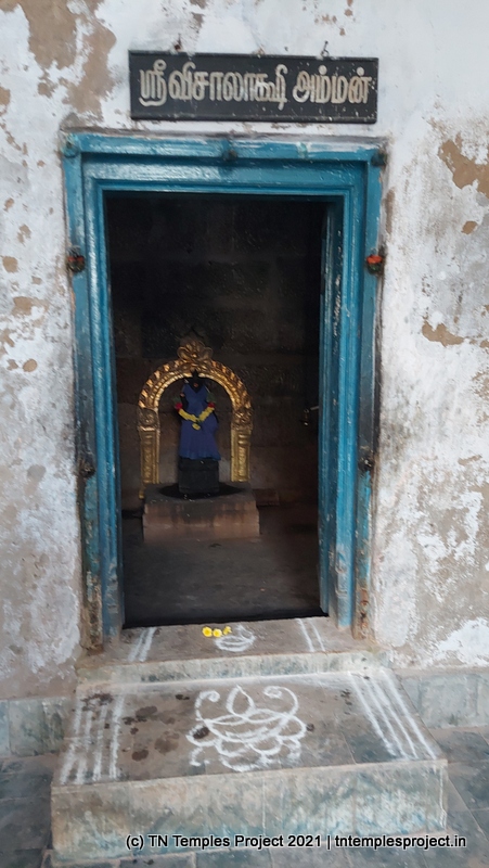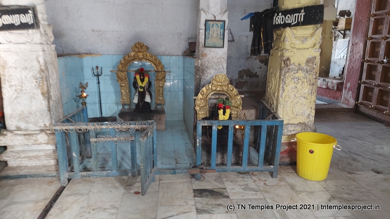 There is a welcome arch above an outer mandapam, following which one enters the main premises. There is a dhwajasthambam, followed by a bali peetham and the mooshikam, and then an elevated shrine for Vinayakar, in the maha mandapam. In the prakaram are a separate Vinayakar, a shrine for Siva as Viswanathar with Visalakshi Amman, Murugan with his consorts Valli and Deivanai, Bhairavar and Saneeswaran, as well as Suryan.