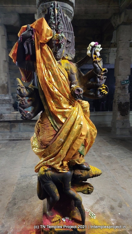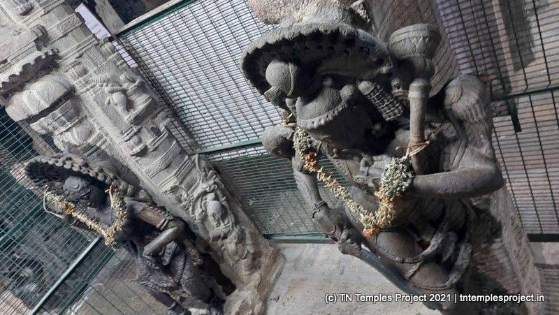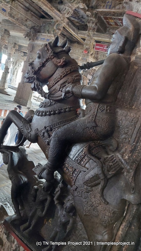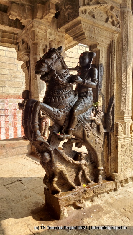 இரண்டு வெவ்வேறு இனக் குதிரைகளின் உயிரோட்டமான சிற்பங்கள் – உள்ளூர் வகை (வெள்ளை நெற்றியுடன் பஞ்ச கல்யாணி, அதில் ஒரு சவாரி செய்பவர் – சிவன் என்று கருதப்படுகிறார் – அமர்ந்திருக்கிறார்) மற்றும் அரேபிய வகை (தவும்பரி) ஆகியவை கோயில் கட்டப்பட்ட காலத்தில் இறக்குமதி செய்யப்பட்டன (மற்றும் ஸ்தல புராணத்துடன் ஒத்துப்போகின்றன)