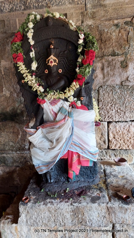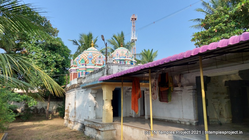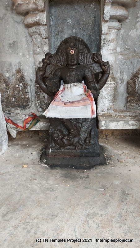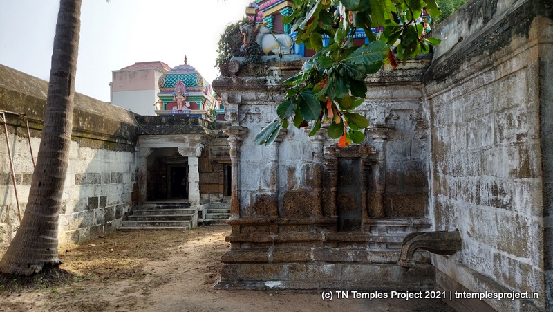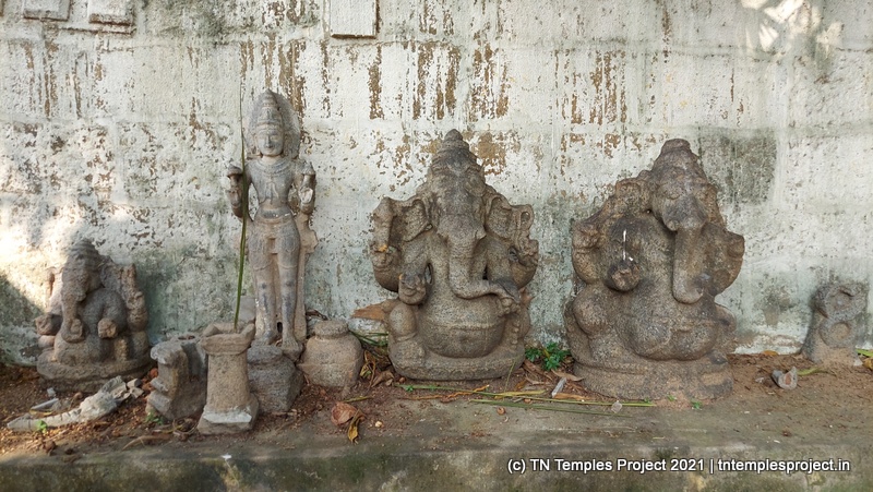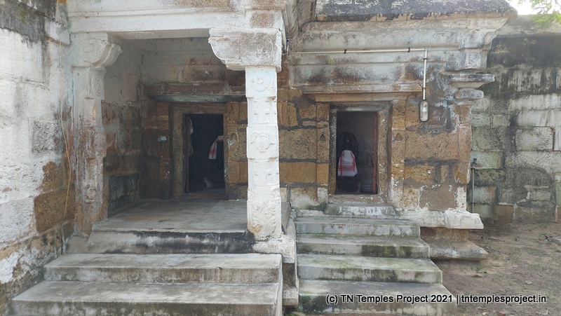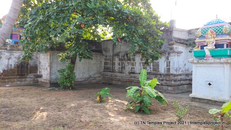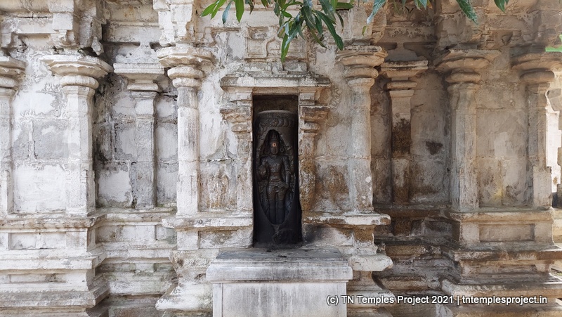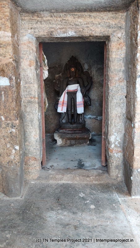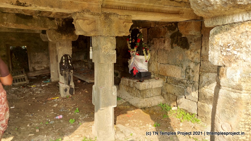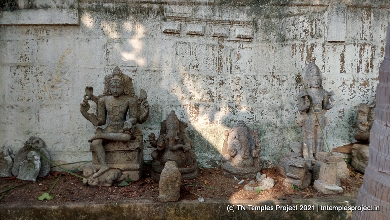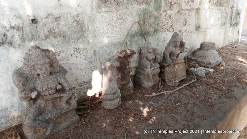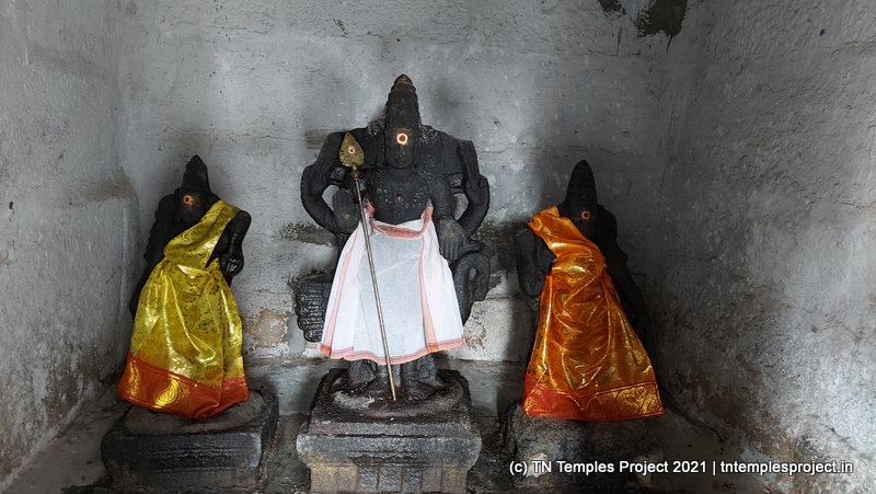 In the koshtam, there are shrines only for Dakshinamurti and Lingodhbhavar. The entire northern part is empty. In the prakaram, there are shrines for Vinayakar, Murugan with his consorts Valli and Deivanai, Chandikeswarar, Bhairavar, Suryan and Chandran. There is no separate Navagraham shrine here. In the prakaram, one can find a number of damaged vigrahams as well.