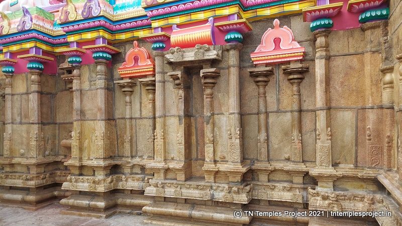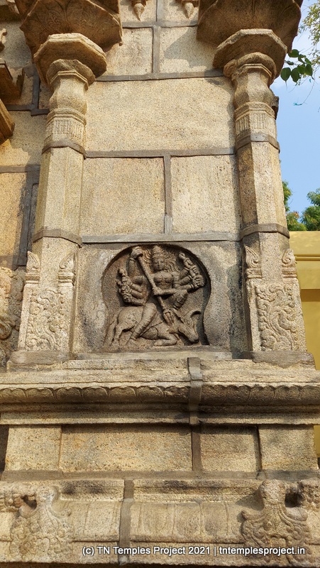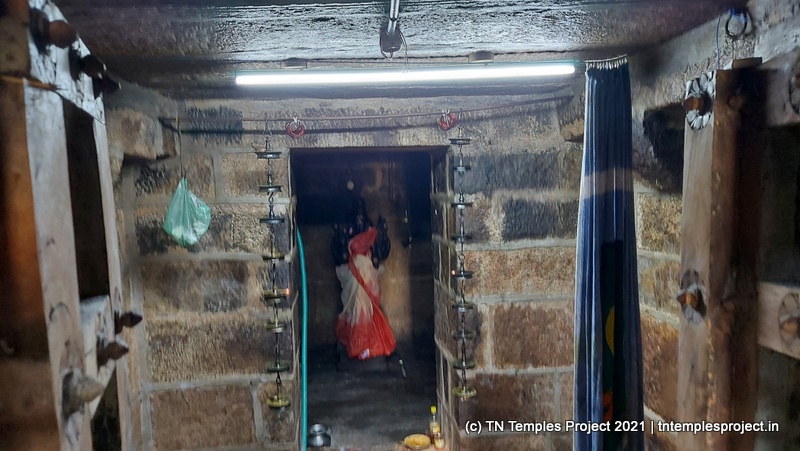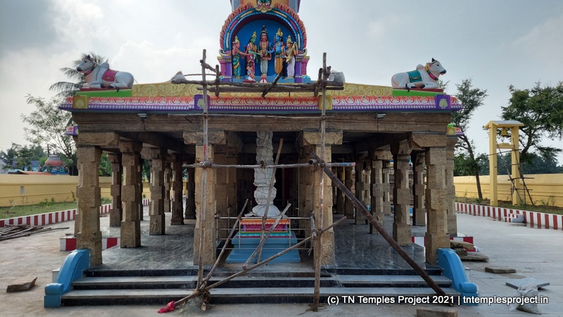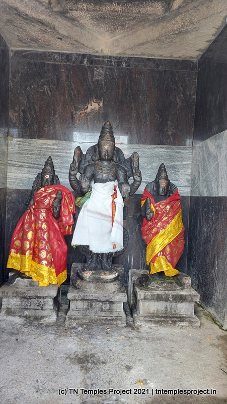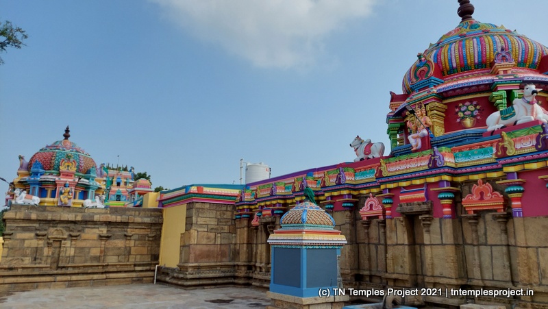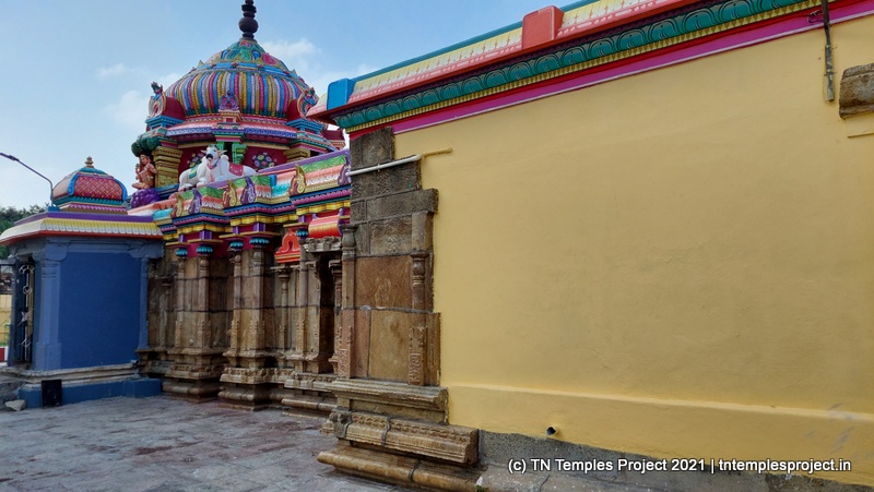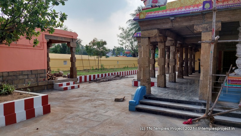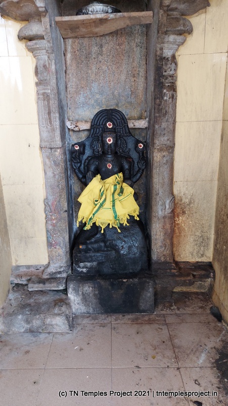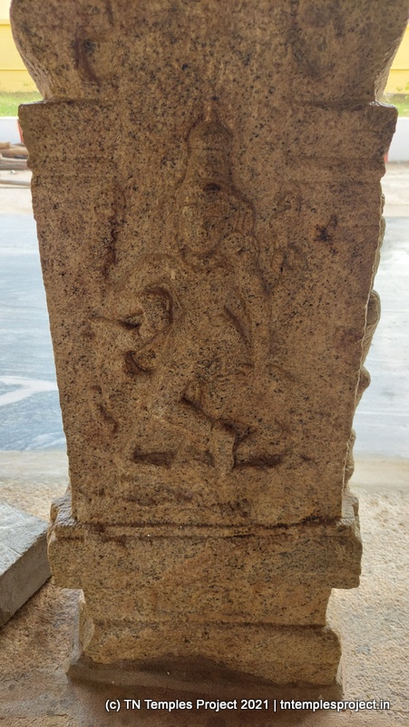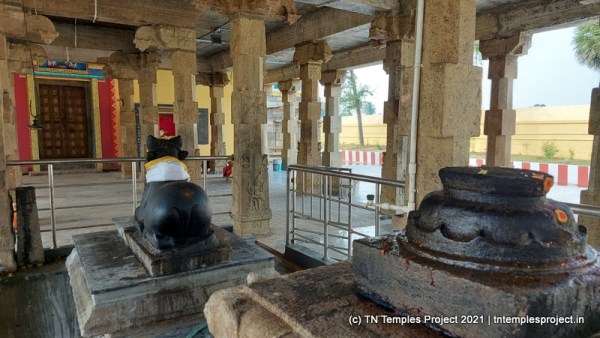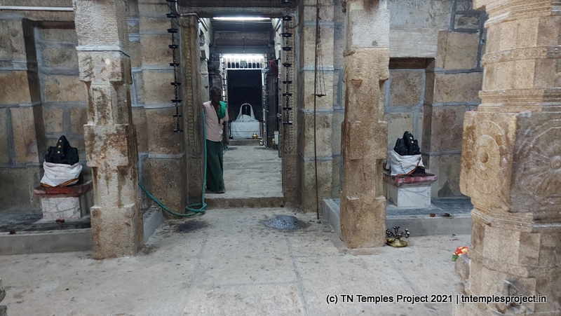 The small but beautiful maha mandapam first has the dhwajasthambam, bali peetham and a Nandi, and also has a number of pillars with intricate bas relief carvings. Straight ahead is the garbhagriham while the south-facing Amman shrine is to the right. In the koshtam is only a shrine for Dakshinamurti; none of the other usual koshtam deities are present – this suggests that the Dakshinamurti shrine was perhaps a later addition. In the prakaram are shrines for Vinayakar, Vishnu with Sridevi and Bhudevi, Murugan with his consorts Valli and Deivanai, Chandikeswarar, Bhairavar, Kali, Suryan and Chandran. There is no separate Navagraham shrine here.