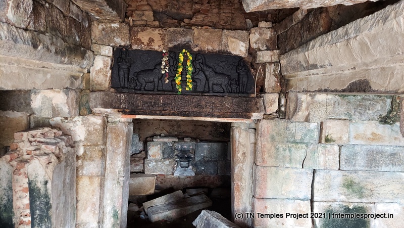 The main structure here has a frontage of thatched roof that is crumbling, resting on wooden pillars – this part of the structure is clearly of more recent origin. The rest is a square mandapam-like structure, with four pillars that bear classic medieval Chola design, and a room – presumably a garbhagriham, given that above the entrance is a toranam on which the bas relief of Gajalakshmi is engraved.