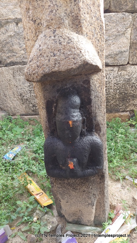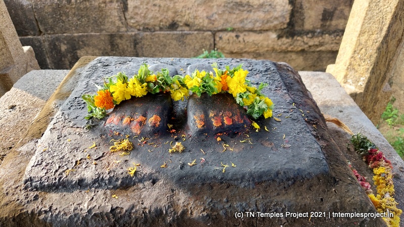 Outside the entrance is a fairly large vigraham of Garuda, and the entrance itself has a decorative gopuram-like structure over it. Inside is the mandapam in which is a pedestal with the carved image of Rama’s feet. Between the outer wall and the inner mandapam is a gap that serves as the circumambulatory passage. On either side are two short pillars, and a human figure in prayer is engraved on each of them.