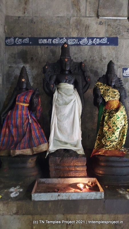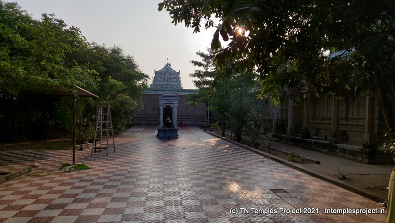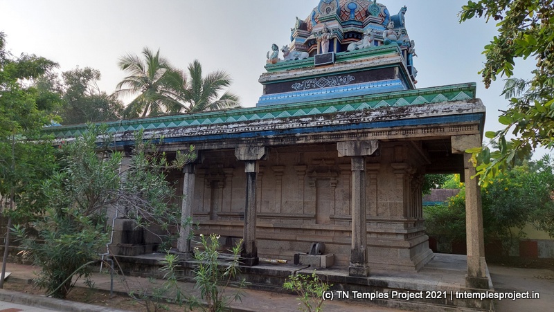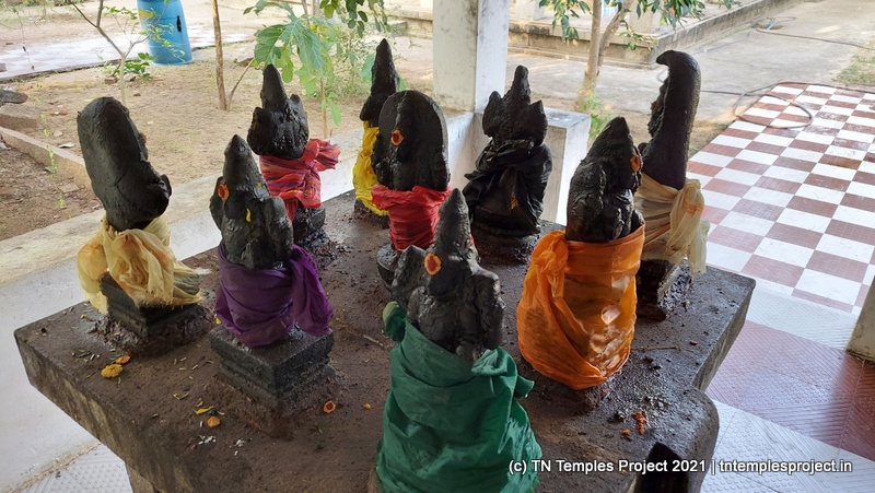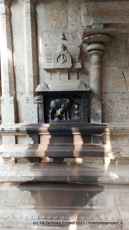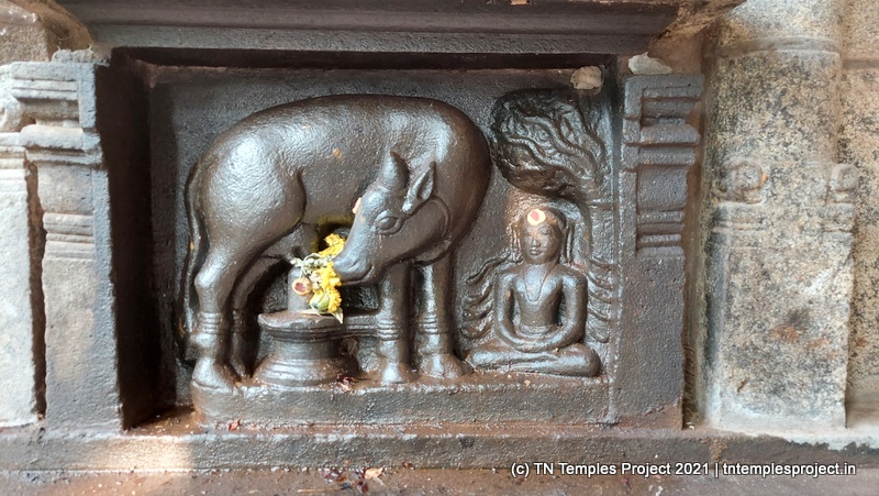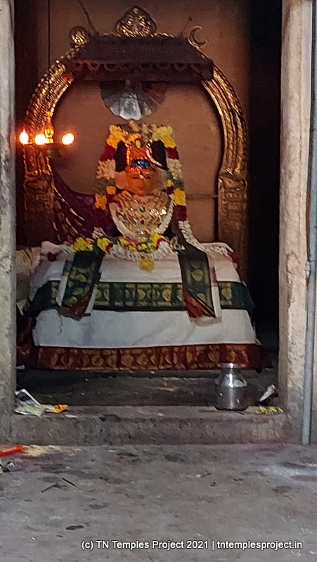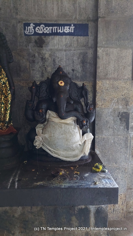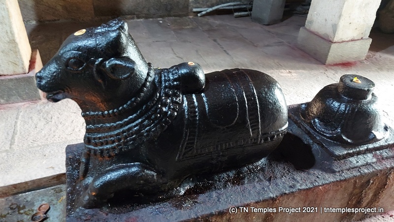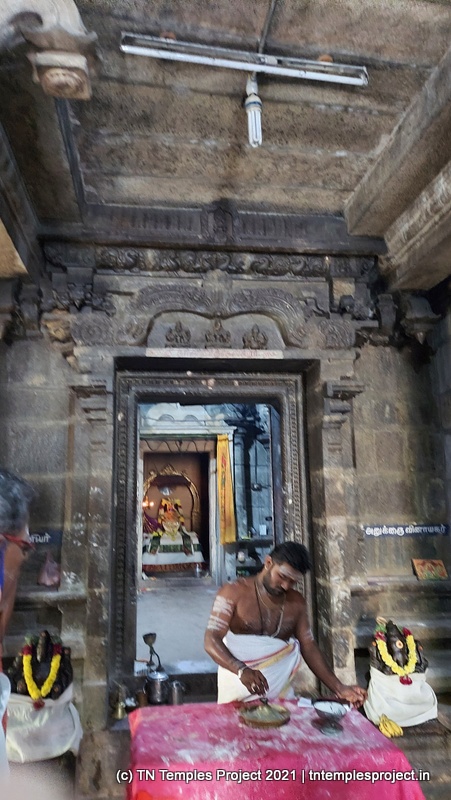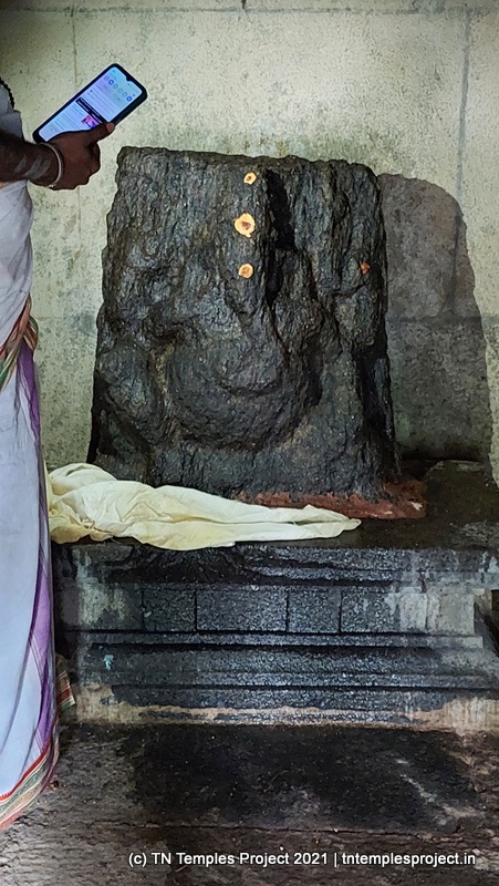 நாங்கள் வருகை தந்த அன்று, மூலவர் லிங்கம், மஞ்சள் மற்றும் சந்தனக் கலவையால் செய்யப்பட்ட அவரது முகத்தின் மானுட வடிவத்துடன் மேலும் அழகுபடுத்தப்பட்டது.கர்ப்பக்கிரகம் மண்டபத்தின் முழு அகலத்தையும் எடுத்துக்கொள்கிறது, எனவே கோஷ்டங்கள் வெளிப் பிரகாரத்தில் திறம்பட உள்ளன, அதாவது உள் பிரகாரம் இல்லை. துர்க்கை, பிரம்மா, லிங்கோத்பவர், தட்சிணாமூர்த்தி (தனியாக, அதாவது நான்கு சனக முனிவர்கள் இல்லாமல்) மற்றும் நர்த்தன விநாயகர் என, மேற்கு நோக்கிய கோயில்களுக்குப் பொருத்தமான வரிசையில் வழக்கமான கோஷ்ட தெய்வங்கள் உள்ளன. சண்டிகேஸ்வரரும் வடக்குப் பகுதியில் இருக்கிறார். பிரகாரத்தில் பைரவருக்கும் நவக்கிரகத்துக்கும் தனித்தனி சன்னதிகள் உள்ளன. வெளிப்புறச் சுவரில் பல இடங்களில், புராணங்களில் இருந்து வரும் காட்சிகளின் மினியேச்சர் பாஸ் நிவாரணப் படங்கள் மற்றும் தனிப்பட்ட தெய்வங்கள் உள்ளன. இங்கு வசிக்கும் விநாயகர் ஒரு சுயம்பு வலம்புரி விநாயகர் ஆவார், அவர் ஒரு தனி விக்ரஹமாக சித்தரிக்கப்படவில்லை, ஆனால் ஒரு பெரிய கருப்பு கிரானைட் துண்டின் மீது அடித்தளமாக சித்தரிக்கப்படுகிறார்.