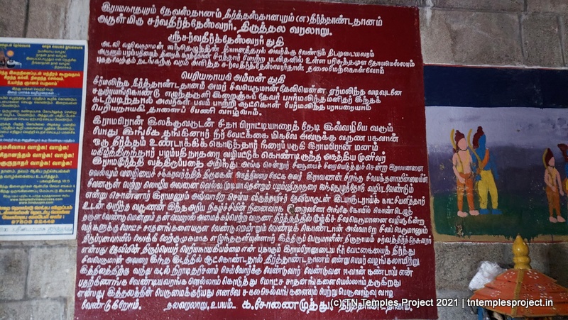 வேதாரண்யத்தில் இருந்து ராமேஸ்வரம் செல்லும் இந்த வழித்தடத்தில் உள்ள பல இடங்களைப் போலவே இந்த பழமையான கோயிலும் ராமாயணத்துடன் இணைக்கப்பட்டுள்ளது. சீதையை தேடும் போது ராமர் இந்த இடத்திற்கு வந்தார். சோர்வாக உணர்ந்த அவர், இங்கு சிறிது நேரம் ஓய்வெடுத்தார். பின்னர் அவர் தாகத்தால் தாக்கப்பட்டார், அவருடைய தெய்வீகத்தன்மையை அறிந்த வருணன் – மழைக் கடவுள் – இங்கு மழை பெய்யச் செய்தார், மேலும் ஒரு குளத்தில் சேகரிக்கப்பட்ட மழைநீரால் ராமர் தனது தாகத்தைப் போக்கினார். இந்தக் குளம் வருண தீர்த்தம் என்று அழைக்கப்பட்டது. அகஸ்திய முனிவர் திருப்புனவாசலில் சிவனை வழிபட்டுக் கொண்டிருந்த நேரத்தில், ராமர் வந்ததைக் கேள்விப்பட்டு, முனிவர் இங்கு விரைந்தார். ராமனிடம் தன் வருகையின் நோக்கம் என்னவென்று விசாரித்தார். ராமர் சீதையைத் தேடி வருவதாகவும், போரில் ராவணனை தோற்கடிக்க விரும்புவதாகவும் தெரிவிக்கப்பட்டபோது, முனிவர் இராவணன் ஒரு சிறந்த சிவபக்தன் என்பதால், சிவனின் அருள் இல்லாமல் அவ்வாறு செய்வது கடினம் என்று ராமரை எச்சரித்தார். ராமர், அகஸ்தியரின் வழிகாட்டுதலின்படி, வருண தீர்த்தத்தில் நீராடி, இங்கிருந்தே திருப்புனவாசலில் உள்ள விருத்தபுரீஸ்வரரை வணங்கினார், சிவன் ரிஷப வாகனத்தில் அம்மனுடன் காட்சியளித்தார். இராவணனை வெல்வதற்குத் தேவையான வலிமையை இராமனுக்கு அருளினார்.