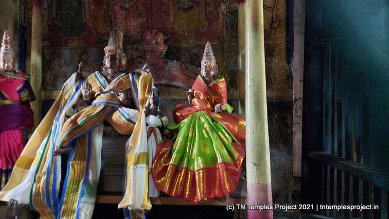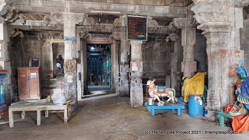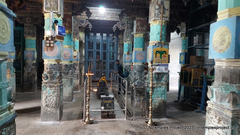 இது தூண்களால் அலங்கரிக்கப்பட்ட மகா மண்டபத்திற்கு நம்மை அழைத்துச் செல்கிறது. உள்ளே உள்ள மகா மண்டபத்தின் மேல் மட்டத்தில், பல்வேறு நடனக் காட்சிகளில் சிற்பங்கள் பொறிக்கப்பட்டு, அற்புதமாகச் செய்யப்பட்டுள்ளன. அர்த்த மண்டபத்தின் நுழைவாயிலில் இரண்டு துவாரபாலகர்கள். அர்த்த மண்டபத்தில் வெவ்வேறு காலகட்டங்களில் பல தூண்கள் உள்ளன, அவற்றில் பெரும்பாலானவை வழக்கமான நகரத்தார் / செட்டிநாடு பாணி கலைப்படைப்பு மற்றும் ஓவியம் ஆகியவற்றால் மூடப்பட்டிருக்கும். ஒருபுறம் அப்பர், சம்பந்தர், சுந்தரர், மாணிக்கவாசகர், சேக்கிழார் ஆகியோருக்கு விக்ரஹங்கள் உள்ளன. அந்தரலாவின் நுழைவாயிலைக் காக்கும் துவாரபாலகர்களுக்கு மேலும் ஒரு தொகுப்பு.