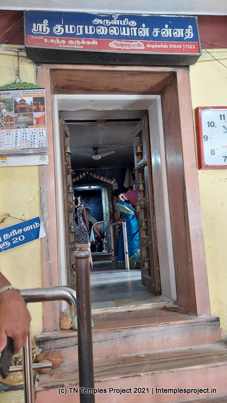 குன்றின் மேல் மேற்கு நோக்கிய முருகனின் சன்னதி உள்ளது, அதன் சொந்த துவஜஸ்தம்பம், பலி பீடம் மற்றும் மயூர மண்டபம் (முருகனின் வாகனமான மயிலுக்கு), அத்துடன் தரையில் நடப்பட்ட ஒரு வேலும் உள்ளது. உள்ளே ஒரு செவ்வக மண்டபம் உள்ளது, அதைத் தொடர்ந்து அர்த்த மண்டபம் மற்றும் கர்ப்பக்கிரகம் உள்ளது. வெளியே சிறிய சன்னதிகள் உள்ளன, அவற்றில் ஒரு தனி நவக்கிரகம் சன்னதி மற்றும் ஒரு ஐயப்பனுக்கு ஒரு சன்னதி ஆகியவை அடங்கும். தெற்கில் சங்கு சுனை தீர்த்தத்திற்கு வழிவகுக்கும் ஒரு தனி வெளியேறும் இடம் உள்ளது.