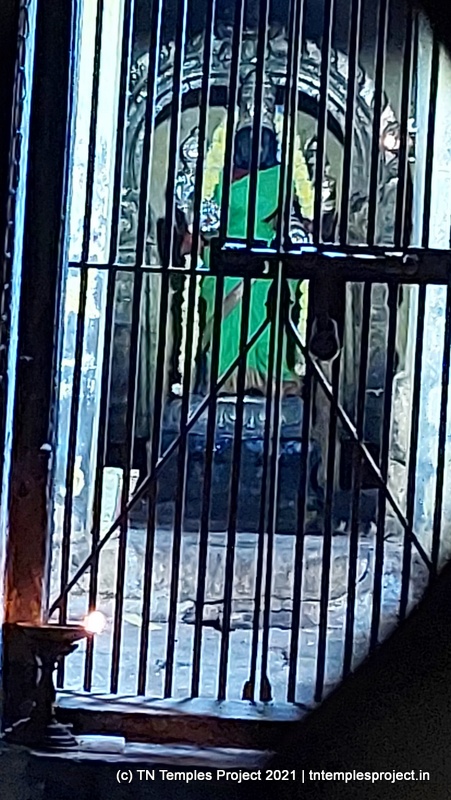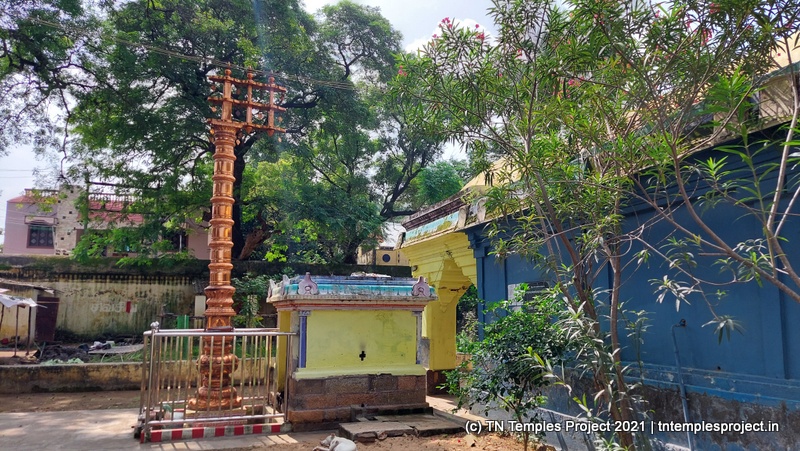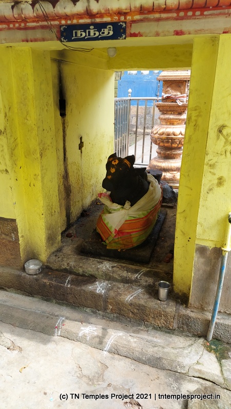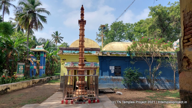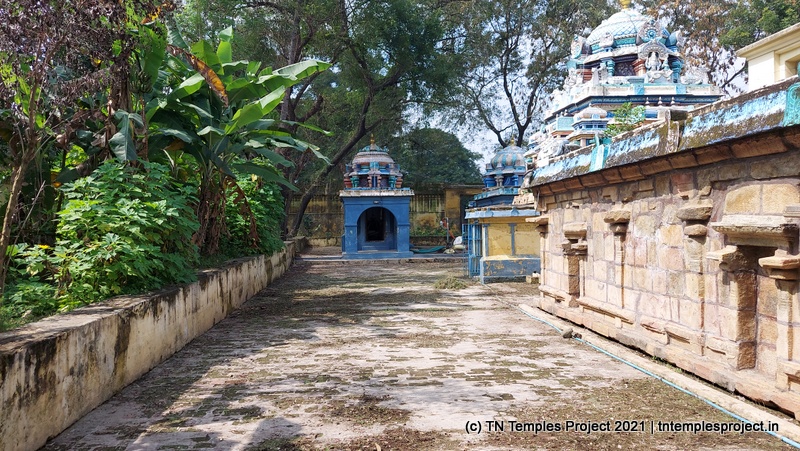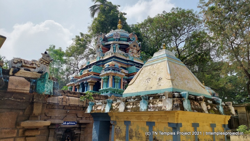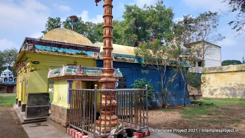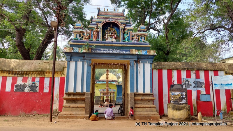மற்ற கோயில்களில் இருந்து முழு கோயில் அமைப்பும் சற்று வித்தியாசமானது. ராஜகோபுரம் இல்லை; அதற்கு பதிலாக ஒரு வரவேற்பு வளைவு உள்ளது, இது துவஜஸ்தம்பம் இருக்கும் ஒரு திறந்த பகுதிக்கு செல்கிறது. இதற்கு அப்பால் ஒரு திறந்தவெளி, வலதுபுறம் அம்மன் சன்னதி உள்ளது. அம்மன் சன்னதி த்வஜஸ்தம்பத்தின் முன் உள்ள நந்தி மண்டபம் வரை நீண்டு (பின்னர் கட்டப்பட்டது) எனவே இங்கிருந்து மகா மண்டபத்தை நேரடியாகப் பார்க்க முடியாது.
