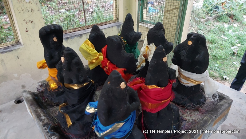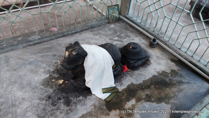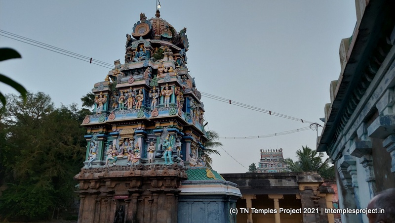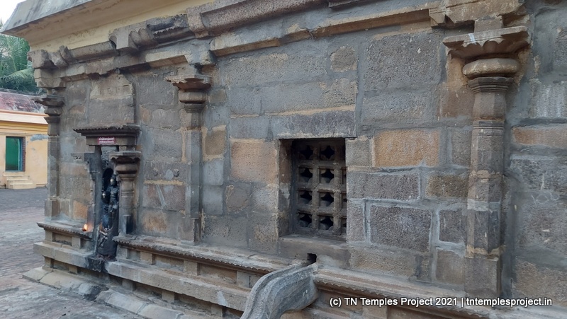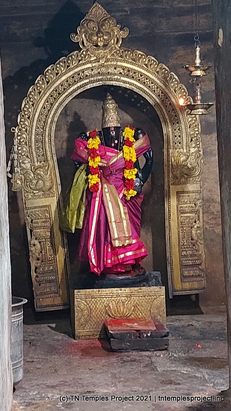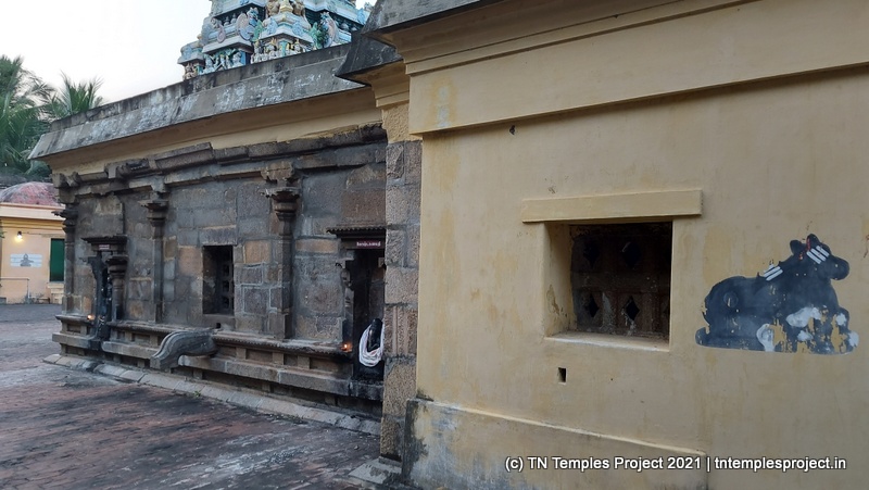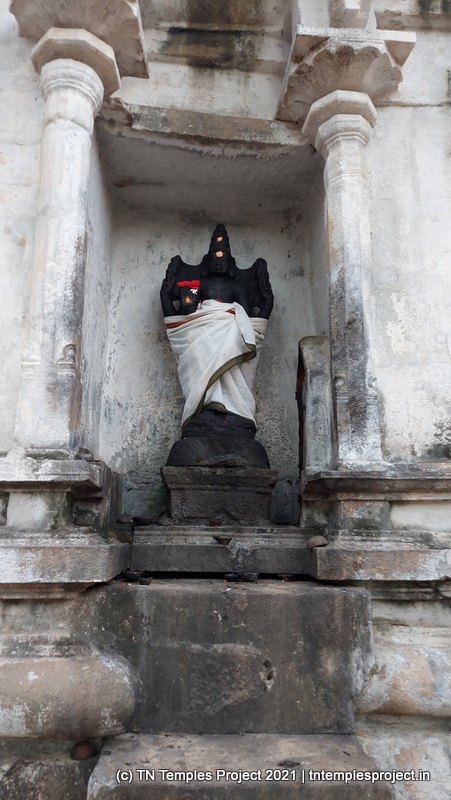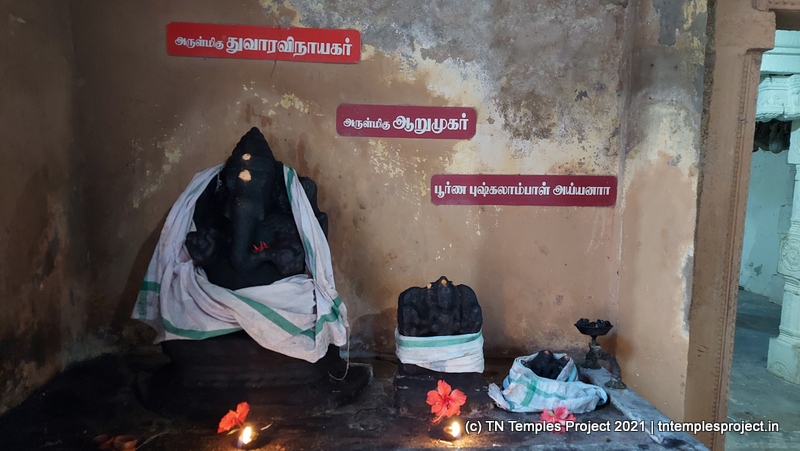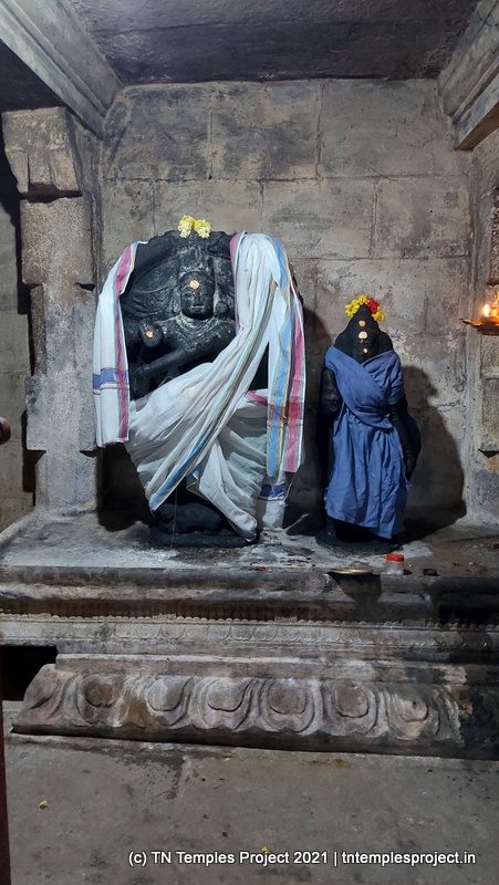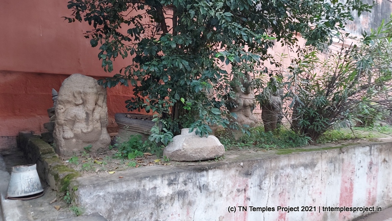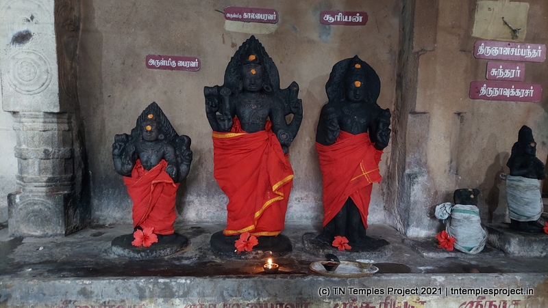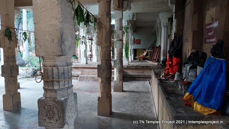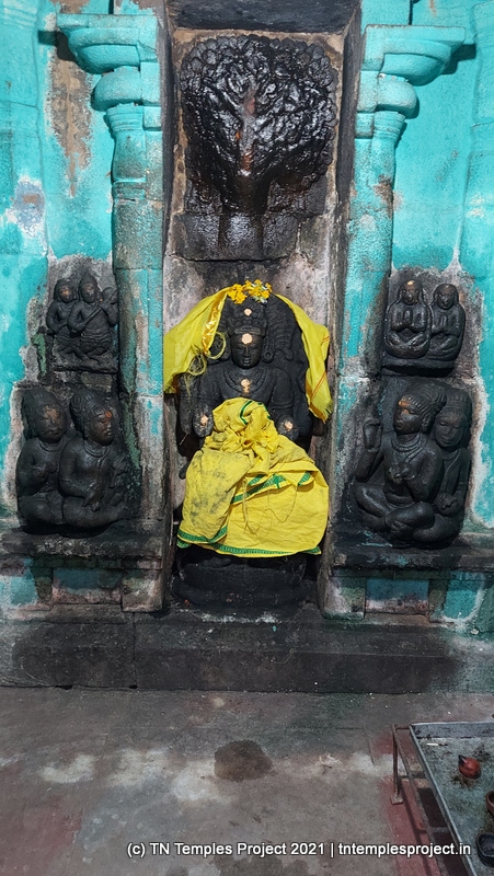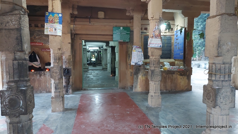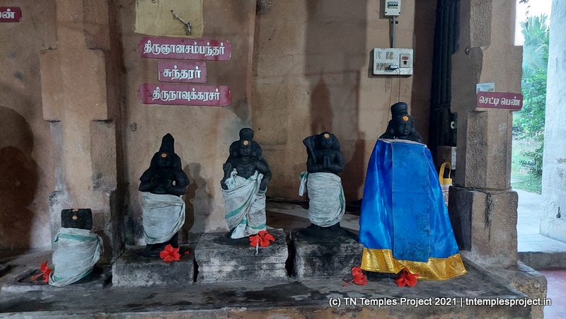 அர்த்த மண்டபத்தின் வெளிப்புறச் சுவரில் தெற்கில் விநாயகர் மற்றும் லிங்கோத்பவர் உள்ளனர் (பிந்தையது மிகவும் அசாதாரணமானது). அர்த்த மண்டபத்தின் வடக்குச் சுவரில் அத்தகைய தெய்வங்கள் இல்லை. கர்ப்பகிரஹத்தைச் சுற்றியுள்ள கோஷ்டத்தில் வழக்கமான தெய்வங்கள் – விநாயகர், தட்சிணாமூர்த்தி, அர்த்தநாரீஸ்வரர், பிரம்மா மற்றும் துர்க்கை. பிரகாரத்தில் விநாயகர், முருகன் துணைவியார் வள்ளி, தெய்வானை, கைலாய லிங்கம், கஜலட்சுமி, சண்டிகேஸ்வரர் மற்றும் இரட்டை பைரவர் சன்னதிகள் உள்ளன. அப்பர், சம்பந்தர் சன்னதிகளும் உள்ளன.