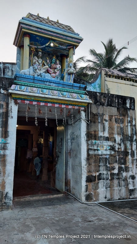 கோபுரத்துக்கும் மகா மண்டபத்துக்கும் இடையே பெரிய இடைவெளியுடன் கோயில் சிறப்பாக அமைக்கப்பட்டுள்ளது. த்வஜஸ்தம்பம் இல்லை, ஆனால் பலி பீடம் உள்ளது. இவற்றின் வலதுபுறம் பிரதான மண்டபத்திற்கு வெளியே அம்மன் சன்னதி உள்ளது. கைலாசத்தில் காட்சியை சித்தரிக்கும் அழகிய ஸ்டக்கோ படம் நுழைவாயிலை அலங்கரிக்கிறது. உள்ளே, அர்த்த மண்டபம், அந்தரளம் மற்றும் கர்ப்பகிரகம் ஆகியவற்றை உள்ளடக்கிய மற்றொரு நடைபாதை நம்மை கருவறைக்கு அழைத்துச் செல்கிறது. கர்ப்பிணிப் பெண் தேங்காயைப் பெறும் கதை ஒரு தூணில் அடித்தளத்தில் சித்தரிக்கப்பட்டுள்ளது. கர்ப்பகிரஹத்தின் நுழைவாயிலில் விநாயகர், முருகன், அய்யனார் மற்றும் அவரது துணைவிகளான பூர்ணா மற்றும் புஷ்கலா ஆகியோருடன் சன்னதி உள்ளது.