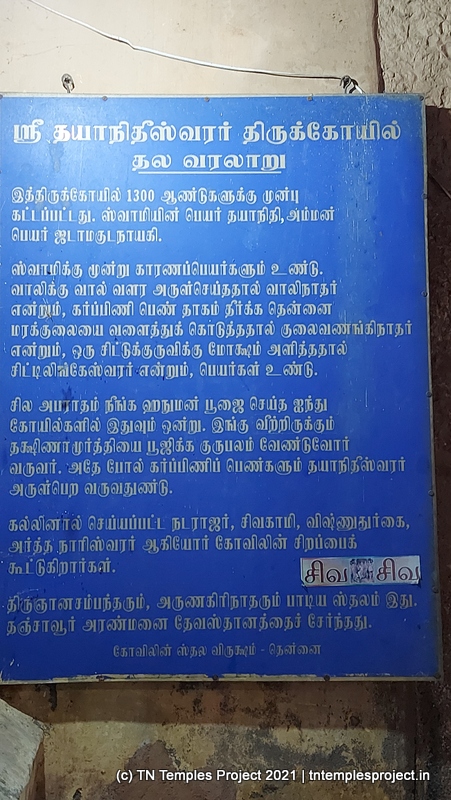 பொதுவாக, கர்ப்பிணிப் பெண்கள் கோயில்களுக்குச் செல்ல வேண்டாம் என்று அறிவுறுத்தப்படுகிறார்கள் (இது தொடர்பான மூடநம்பிக்கைகள் இருந்தபோதிலும், இந்த அறிவுரையின் நடைமுறையானது பழங்காலத்தில் கோயில்களின் சீரற்ற தரையிறக்கத்தில் இருந்து வந்தது, இது கால் இடறி கீழே விழும் அபாயத்தை ஏற்படுத்தியது). இருப்பினும், கர்ப்பிணிப் பெண்கள் வழிபாட்டிற்காக இந்தக் கோயிலை நாடுகின்றனர், அதற்குக் காரணம் இங்குள்ள மற்றொரு ஸ்தல புராணம். கோடைக்காலத்தின் உச்சக்கட்டத்தில் ஒரு கர்ப்பிணிப் பெண் இங்கு ஒருமுறை பயணம் செய்து கொண்டிருந்தாள். ஆறு வறண்டு இருந்ததால், அவள் தாகத்தால் இறக்கும் விளிம்பில் இருந்தாள், அவள் ஒரு தென்னை மரத்தைக் கண்டாள். ஆனால் அவளது நிலையைக் கருத்தில் கொண்டு அவளால் மரத்தில் ஏற முடியவில்லை. அவள் உதவிக்காக சிவபெருமானிடம் பிரார்த்தனை செய்ய ஆரம்பித்தாள். இறைவன் ஒரு தென்னை மரத்தை வளைத்து, ஒரு இளஞ்சூடான தேங்காயைப் பறித்து தாகத்தைத் தணிக்கக். உதவினார் தென்னை மரமே இக்கோயிலின் ஸ்தல விருட்சமாகும். சிவபெருமான் பெண்ணுக்கு அருளிய அனைத்து அருளின் களஞ்சியமாக இருப்பதால், அவர் தயாநிதீசுவரர் என்று அழைக்கப்படுகிறார். கர்ப்பிணிப் பெண்ணை தமிழில் செட்டி-பென் என்று அழைப்பர்
