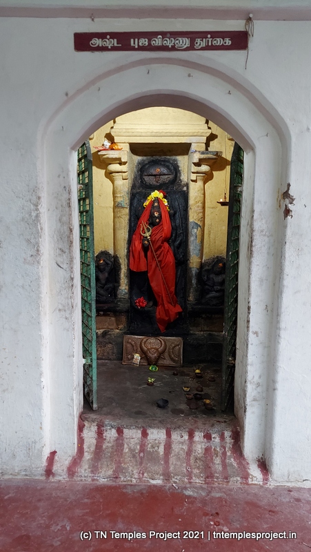 துர்க்கைக்கான கோஷ்டம் சன்னதி அஷ்டபுஜ துர்க்கை, 8 கரங்களுடன் சித்தரிக்கப்பட்டுள்ளது. இந்த துர்க்கையின் தனிச்சிறப்பு என்னவென்றால், இவளுக்கு பால் அபிஷேகம் செய்யும் போது, பால் நீல நிறத்தில் காட்சியளிக்கிறது! பெரும்பாலான கோயில்களில் நடராஜரின் வெண்கல விக்கிரகம் உள்ளது, ஆனால் இந்த கோயில் அசாதாரணமானது, ஒரு சன்னதியில் நடராஜர் மற்றும் சிவகாமி அம்மன் கொண்ட ஒரு கல் சிற்பமும் உள்ளது.
